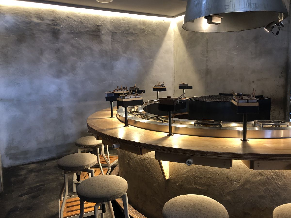 客席はハンバーグを焼く炭台をお客さんが囲む半円型のカウンター席のみ。どの席に座ってもハンバーグの焼き上がりが見え、すぐに手元へ届くという”焼きたて”を体感しやすいライブキッチン型なんです。