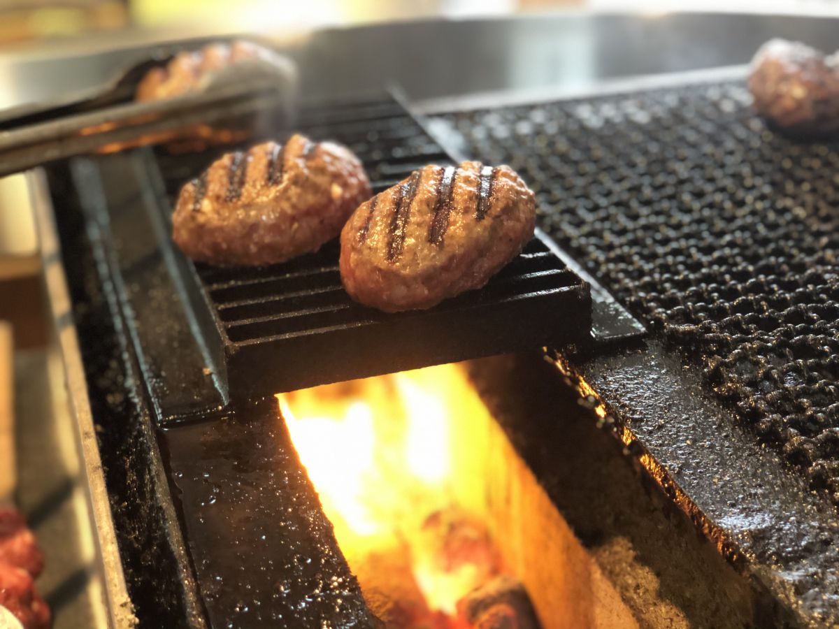 炭火で熱された網ロストルの上にハンバーグが置かれ、まずはしっかりと焼き目をつけます。