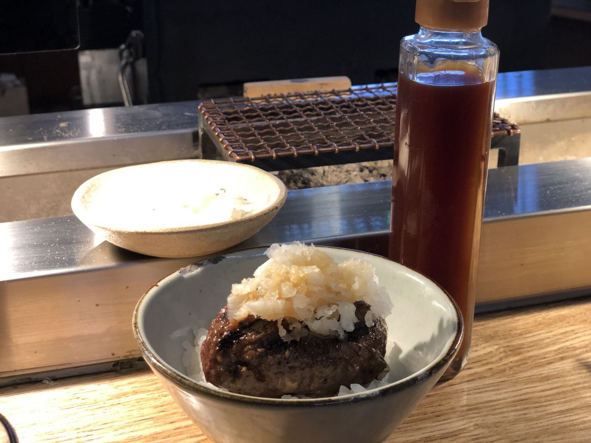 ハンバーグは1個90gと食べやすい大きさ。さっそく2個目をいただきます。次は自家製ポン酢&鬼おろしで味わうのをおすすめしてくれました。