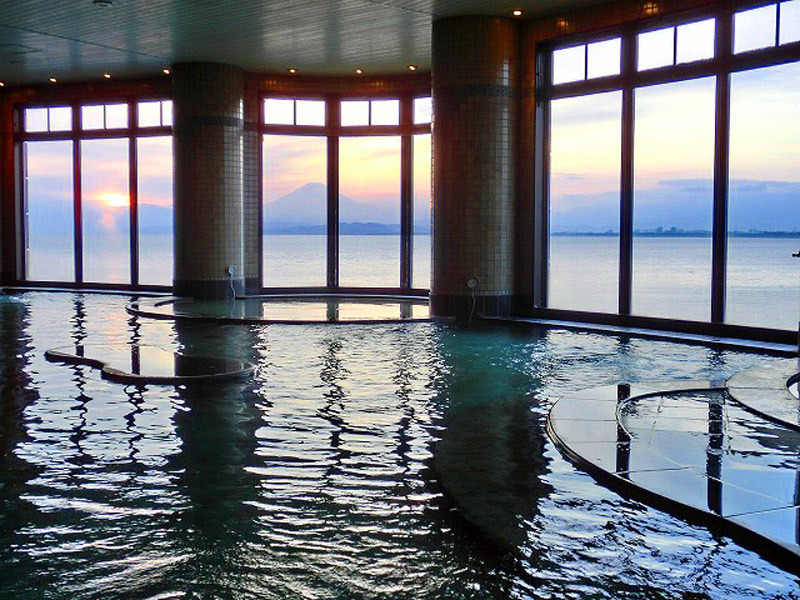 夕暮れには天然温泉をひいている内湯でも、紅色に染まる富士山と海が一望できます。レストランで地元産をはじめとした海産物や野菜を使った料理を味わうことも。一日ゆったり江の島の絶景を眺めて温泉に浸かっていたら、心も体も癒やされること間違いなしですね。