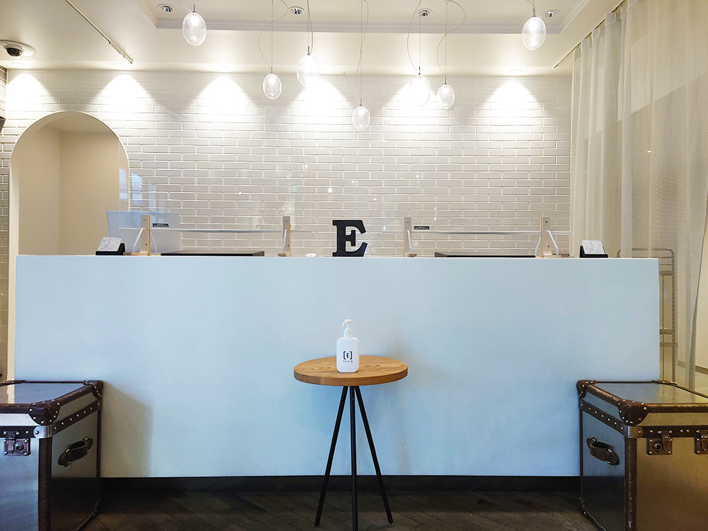 到着すると、白を基調としたフロントが目に飛び込んできます。うしろの壁は、みなとみらいの名所でもある赤レンガ倉庫をイメージし、現物と同じサイズのタイルで設計されているというこだわりっぷり。