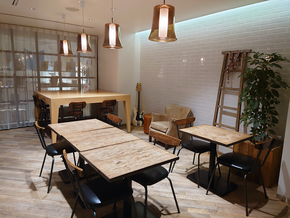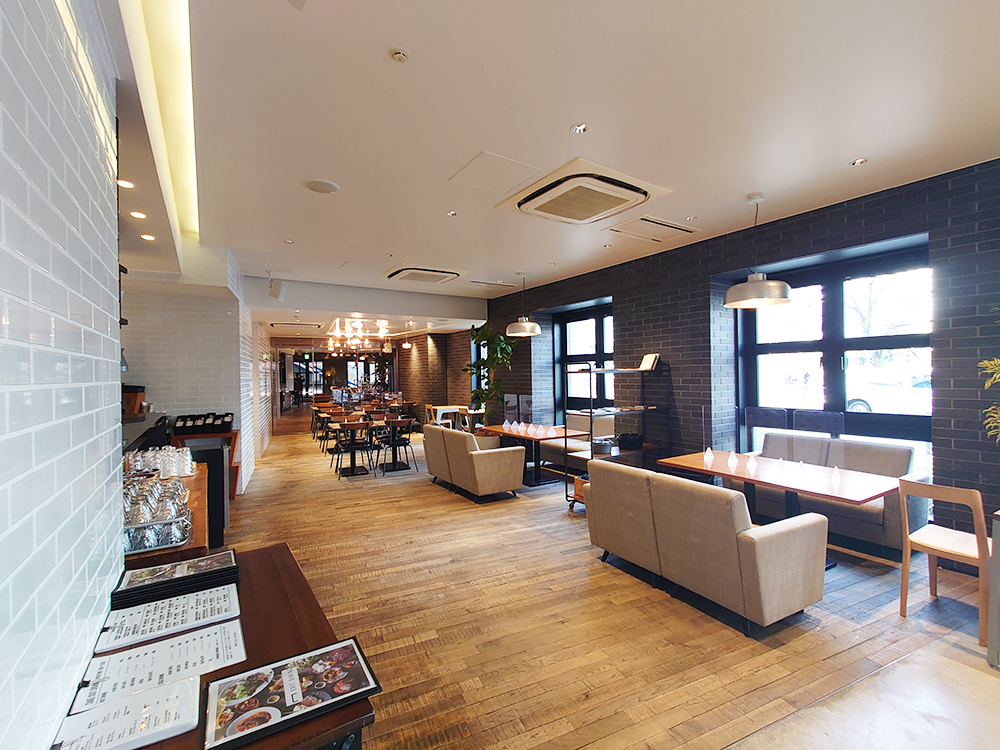 木目調であたたかみのあるこのダイニングは、家で例えるとリビング。テーブル席やソファ席、一人用の席などタイプもさまざまで、食事をしたり会話を楽しんだり、用途に合わせて快適な時間を過ごすことができます。