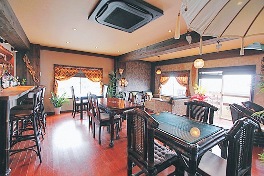 館山の「海辺のダイニングKUMFA」は、北条海岸に面した建物の2階にある多国籍料理の店。店内はバリ島などから取り寄せた、木の温もりが感じられるインテリア で統一されています。バルコニー席からは海に沈む夕日が見える絶好のロケーション。多国籍料理と豊富なドリンクメニューが魅力で、夜はバーとしての利用もおすすめ。