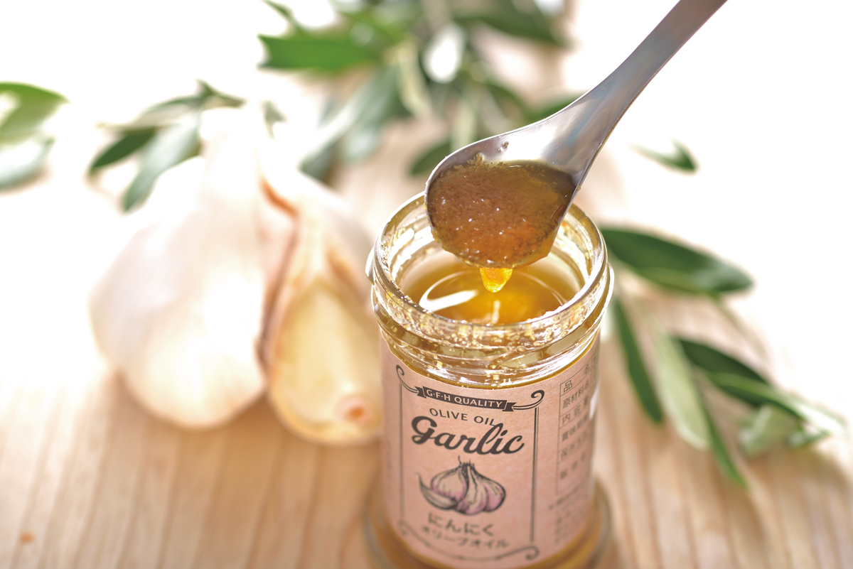 代表の岩城さんが週に3、4瓶は愛用する(!)という、「にんにくオリーブオイル」(864円)も試したい一品。エキストラバージンオリーブオイルに国産ニンニクを浸したもので、入れるだけで味が整う魔法の調味料です。