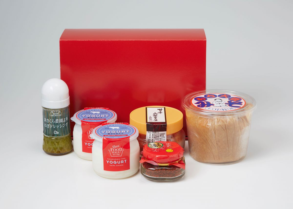 贈り物に最適なセット商品もあり、写真は代表の「岩城紀子セレクトE」(冷蔵3240円)。もち大豆味噌をはじめ、甘辛白菜キムチや葱ドレッシング、ゆずからりん(柚子胡椒)、宝塚牧場ヨーグルトと、リピート率の高い人気商品を詰めわせたもの。送った先の食卓ですぐ使ってもらえそう!