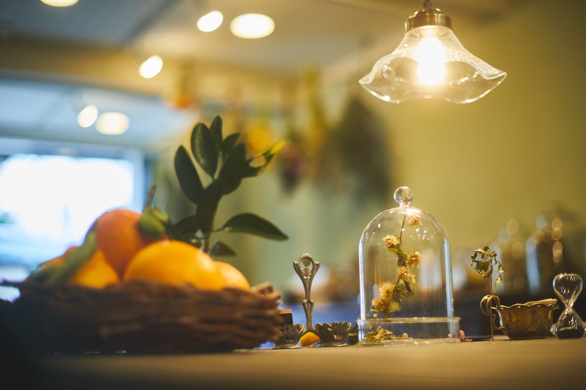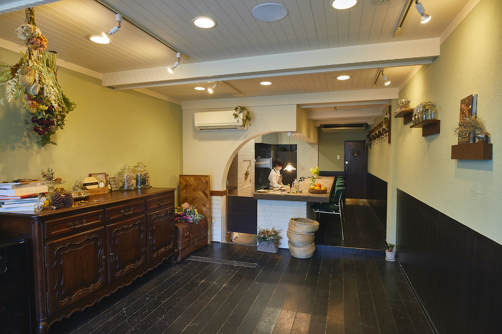 ランプシェードや食器など、杉江さんお気に入りの作家さんが作った温かみのあるモノたちと店内の至る場所に飾られたドライフラワーが、特別な雰囲気を醸し出します。