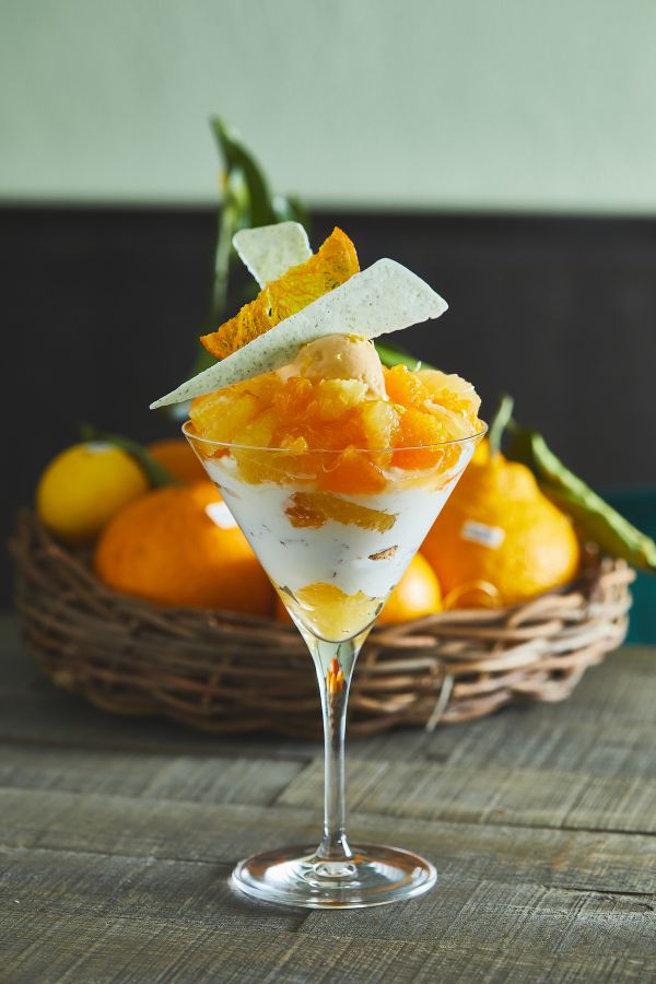 完成した8種類の柑橘のパフェ。グラスの中には、仏手柑(ぶっしゅかん)のアイス、八朔(はっさく)のジュレ、仏手柑と春峰のソース、夏みかんのクリーム、柑橘ピールのシロップ漬けなど、さまざまに姿を変えた柑橘たちがきゅっと詰まっています。