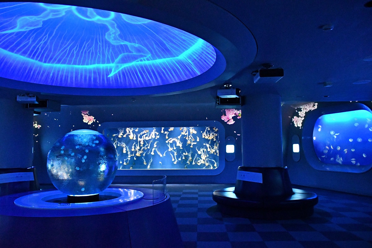 半ドーム式の癒し空間「クラゲファンタジーホール」では、美しいクラゲと桜のコラボレーションを楽しめる演出を、期間限定で投影します。まるでクラゲの体の中にいるみたいに幻想的で、うっとり。