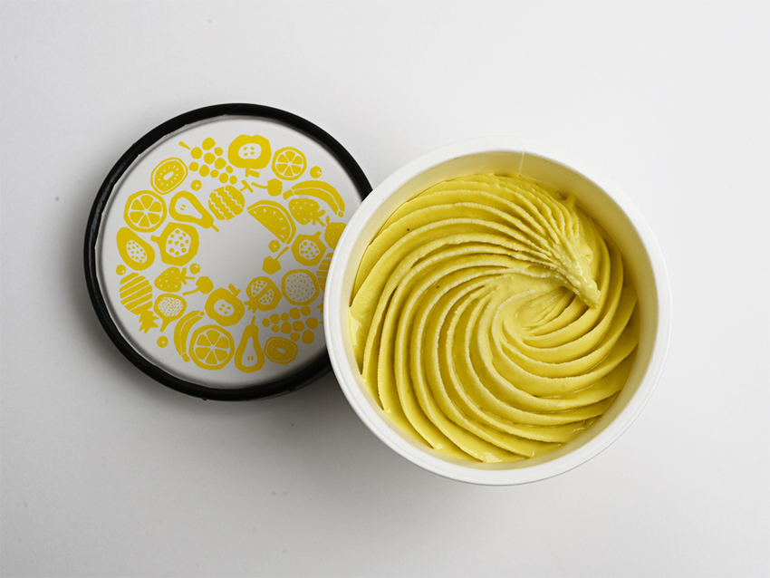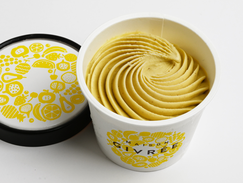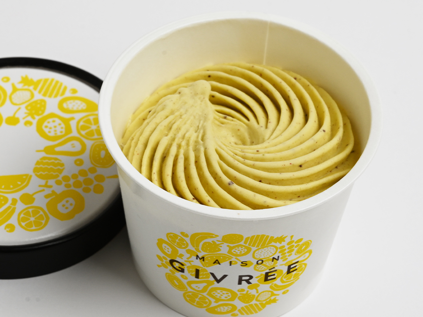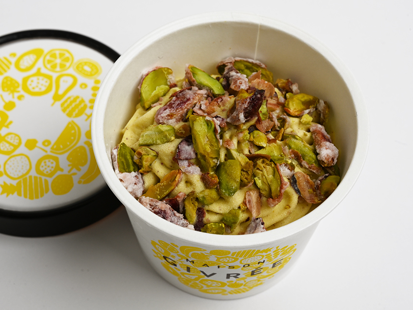 1つ目は「ブロンズ」と名付けられたピスタチオソルベ。イラン産のピスタチオペーストを使用していて、卵不使用のさっぱりとした味わいです。美しいピスタチオイエローが印象的。