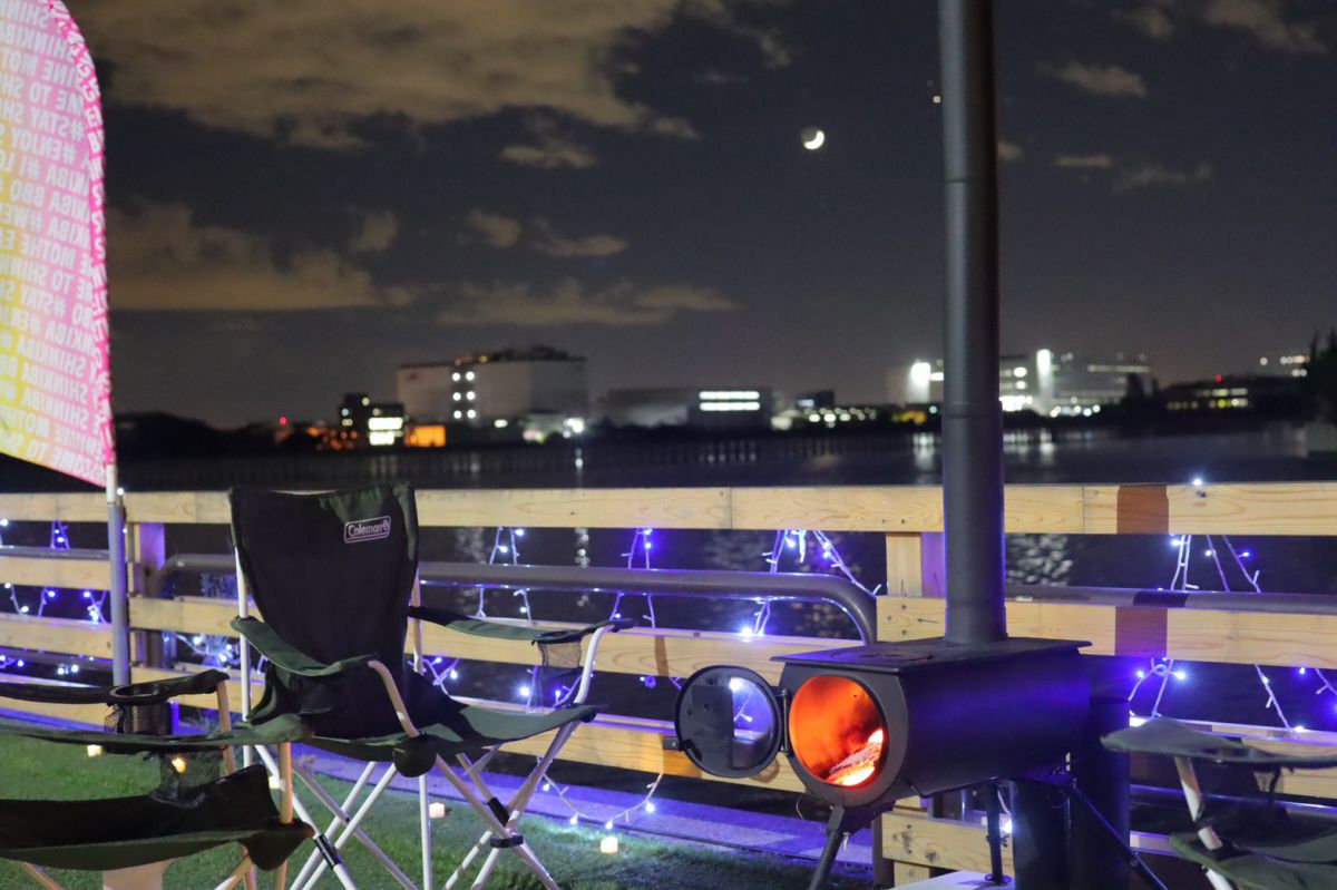 BBQ会場の西側は背の高い建物もなく、夕方には沈んでいく夕陽を見ながら雰囲気抜群のBBQを楽しめるのも魅力。夜にはライトアップもされ、夜空を見上げながら羽田空港発着のジャンボ機を眺めることもできます。