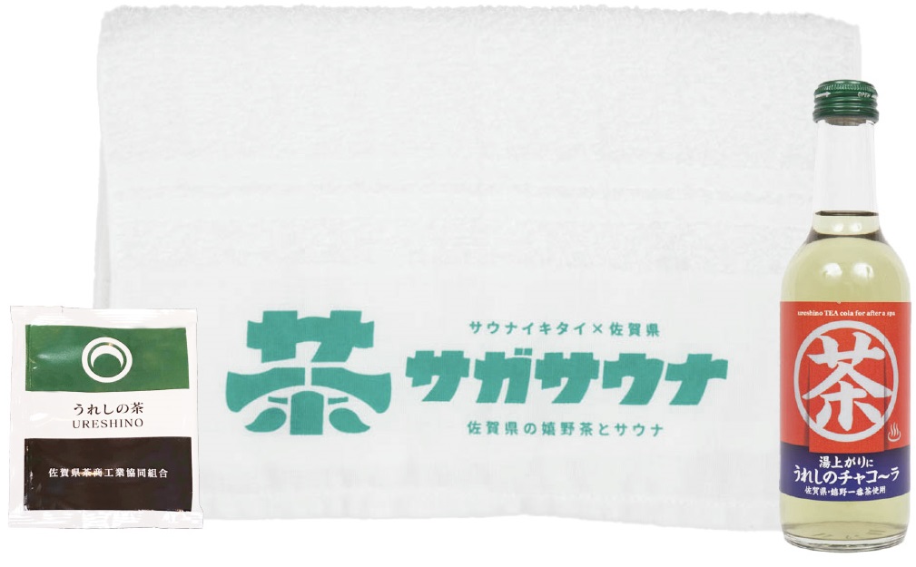 日本におけるお茶栽培発祥の地ともいわれる佐賀県。名産である嬉野茶を手軽に味わえる「うれしの茶一煎パック」や、サウナあがりに飲みやすい嬉野茶がほのかに香る「うれしのチャコーラ」、サウナイキタイがデザインした「サガサウナタオル」など4点を、先着1000名様(各施設100名様)にプレゼントします!