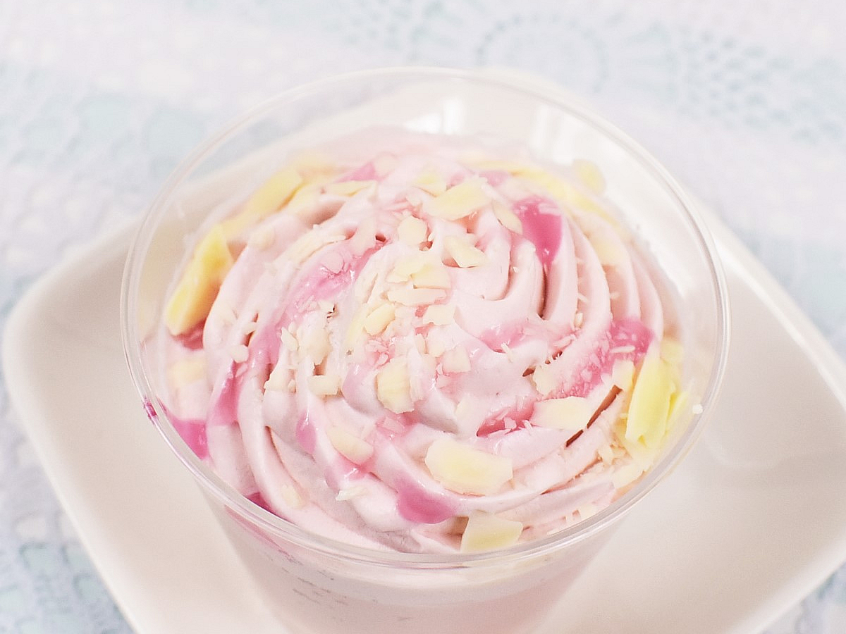 さくら味のミルクプリンに、ふわふわのさくらホイップクリームがトッピングされた「さくらミルクプリン」。その上には、ピンク色のさくらソースとホワイトチョコがふんだんに散りばめられています。