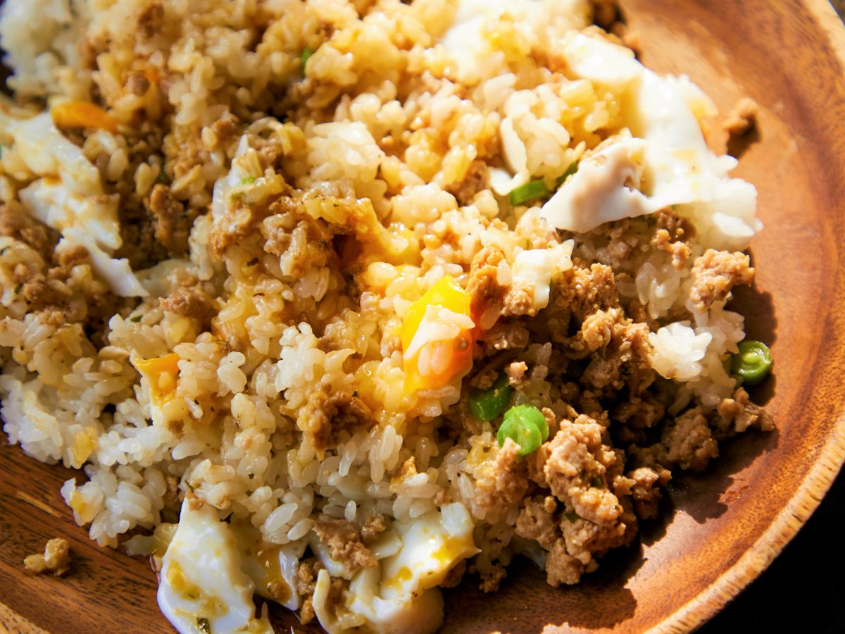 どんどん混ぜて、まだまだ混ぜて、さらに混ぜて。ここまで来たら完成!半熟玉子とスパイシーなひき肉がしっかりとお米に絡んで、やみつきのおいしさ!ピリッとした辛みと独特の香りがクセになります。例えるならば……、香り高く高級なガパオライスといったところ。 “自分で混ぜたらいいのでは?”と一瞬頭をよぎるところですが、絶妙の混ぜ加減がおいしさに直結するので、“混ぜ”はぜひお願いしてみてくださいね!