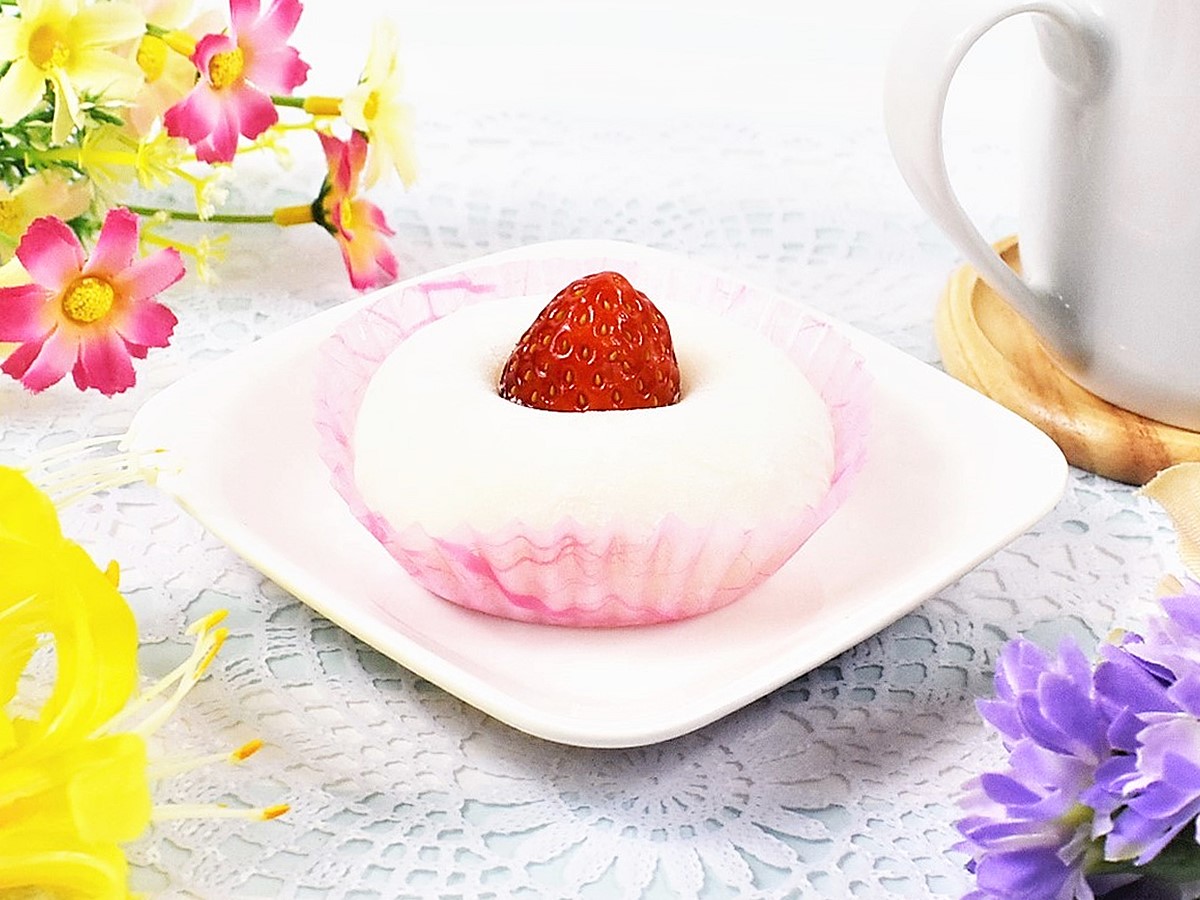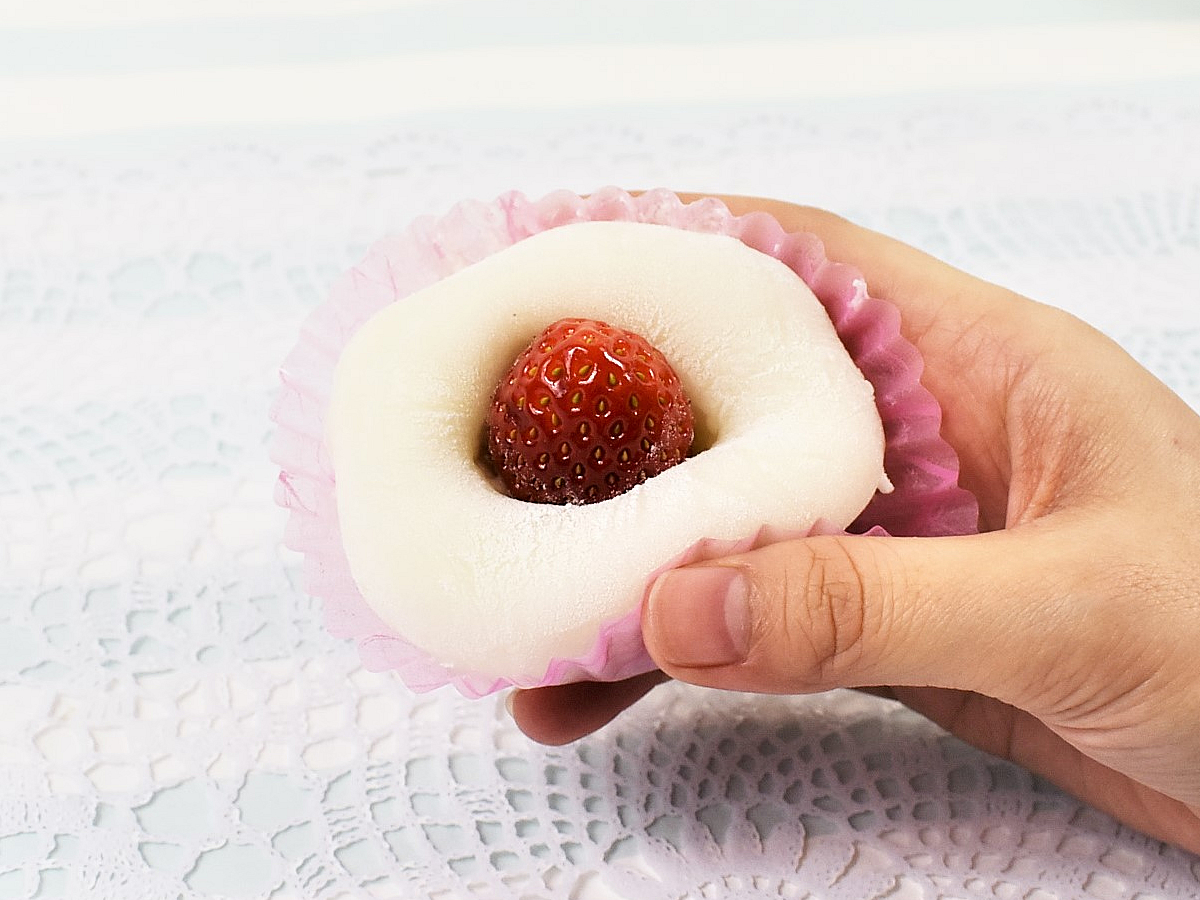 いちご大福といえばお餅の中にいちごが包まれているイメージですが、今回の一品はいちごがてっぺんにチョコンと乗ったスタイル。まるでショートケーキのような姿でかわいらしいですよね。パッと見では中のあんこも見えないため、真っ白なお餅と真っ赤ないちごの色合いもGOOD。キュートな見た目に食べる前からテンションが上がります。