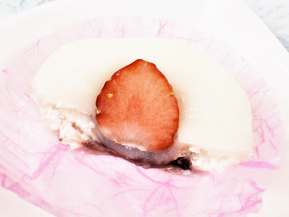 さらに、お餅の中にはつぶあんとホイップクリームがたっぷり。あんこ×クリームは甘すぎるのでは? という心配も今回は必要ありません。いちごの酸味が少々強めなので、クリーム&あんこの甘さとちょうど良いバランスを実現しています。