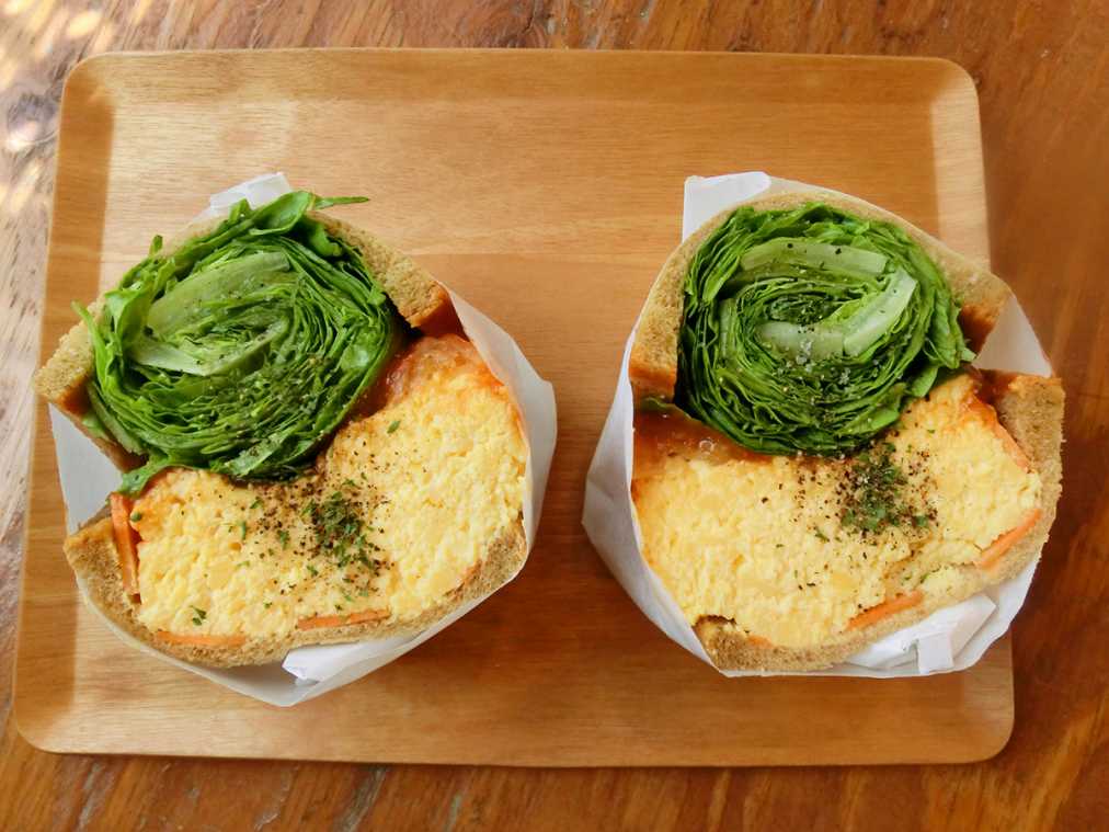 断面が美しい“萌え断”サンドイッチ。その先駆けとなったのが北参道にあるサンドイッチ専門店「POTASTA(ポタスタ)千駄ヶ谷店」です。看板商品は“グルグル巻きのレタス”が入った個性的なビジュアルの卵サンド「スクランブルエッグ&ベジタブル」496円。
