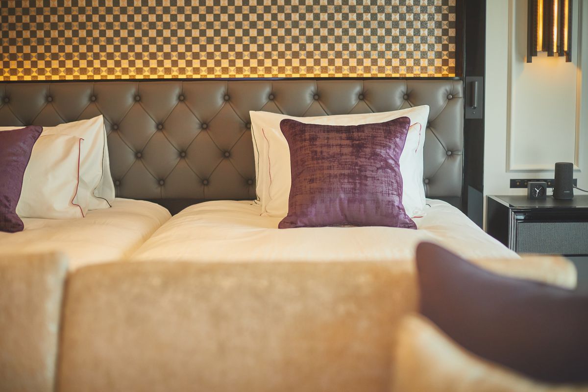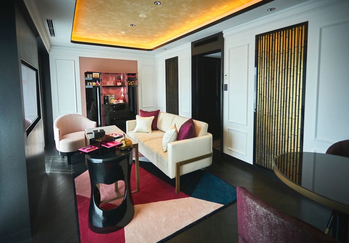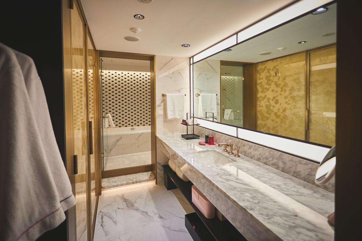 こちらが最上位の「プレステージスイート」。白、黒、ゴールド、フォションピンクの4色のアイコンカラーのうち黒を多く使用したシックなお部屋で、広さは約37畳と、2人占めするには広すぎるほど。ベッドルームが完全にセパレートされていて、一日中ラグジュアリーな時を過ごせそうです。