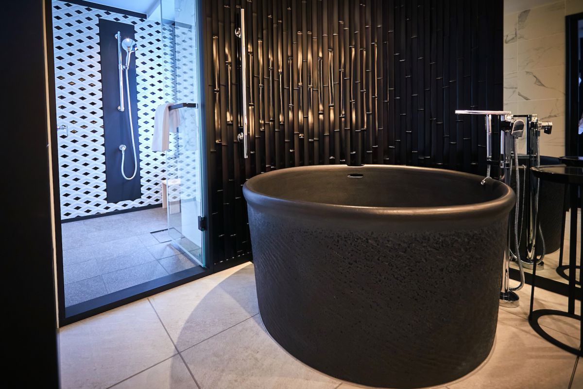 清水焼で焼かれた、すっぽりと肩まで浸かれるバスタブは、ユニットバスに慣れた私たちにも斬新。