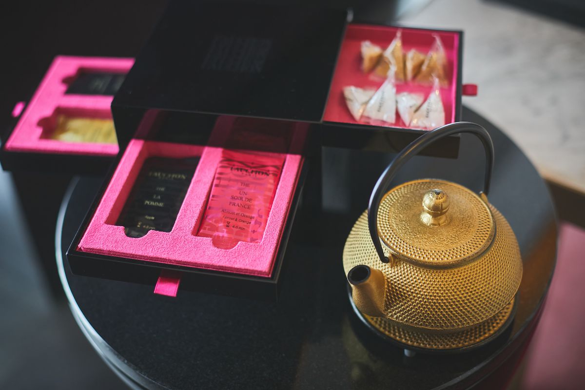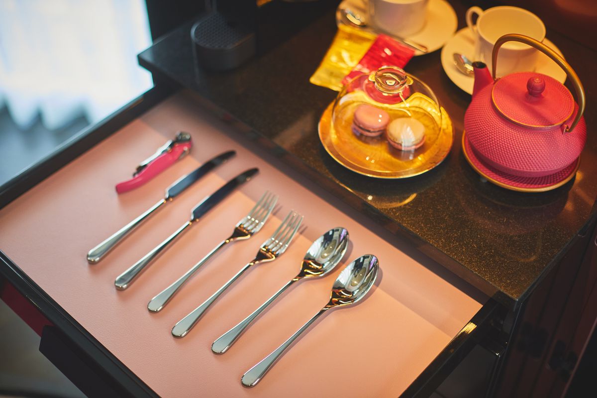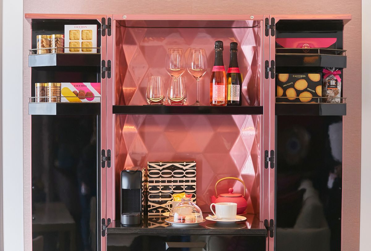 シャンパンピンクに輝くクローゼットを開くと、扉の両翼に焼き菓子、上の棚にロゼシャンパン、下の段にはマカロンとフォションティーが用意されていて、滞在中は食べ放題。なくなれば補充してもらえるので、いつだってお部屋でティータイムが楽しめます。(シャンパンと冷蔵庫のドリンクのみ別途料金)