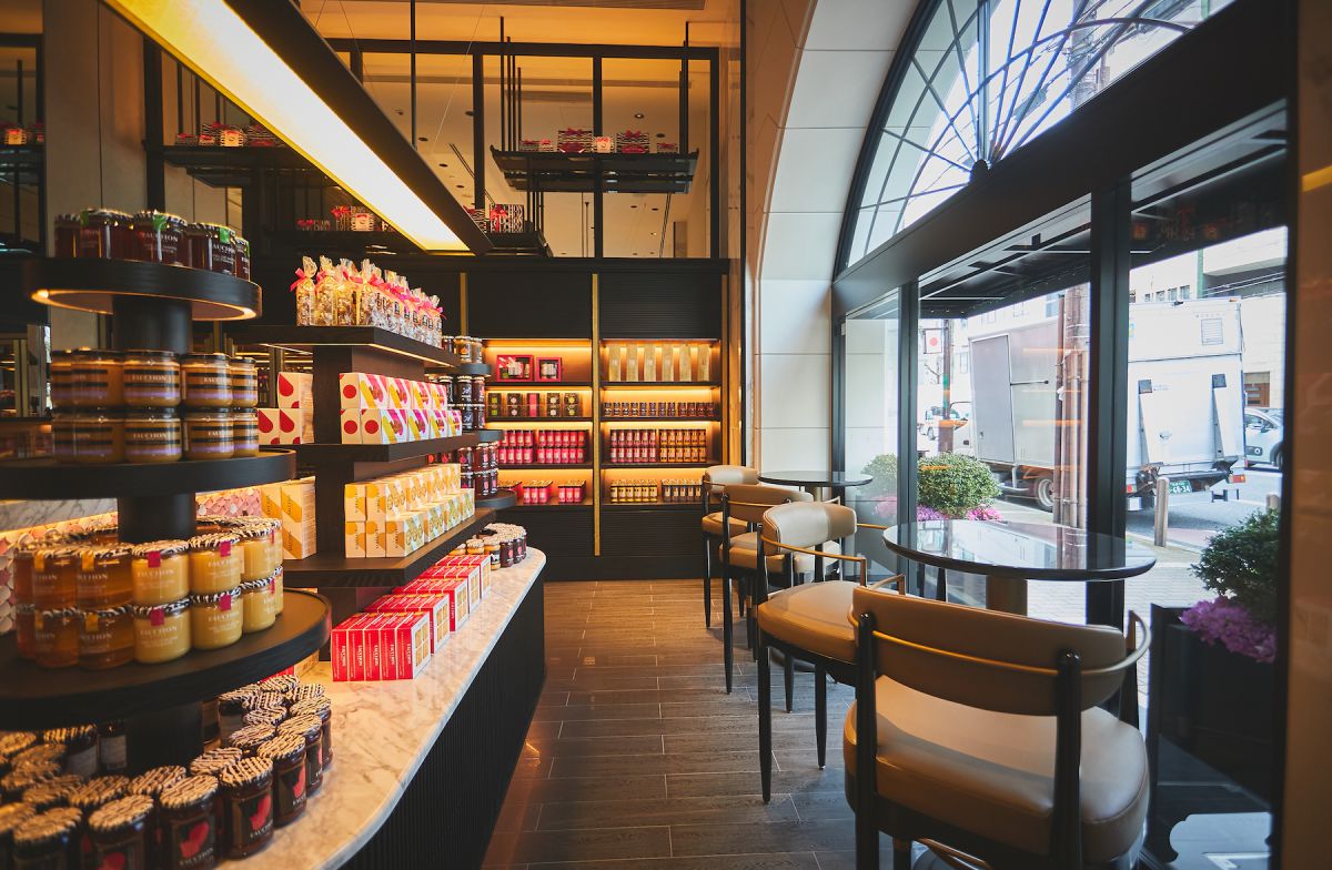 「フォションホテル京都」の3階〜9階は客室ですが、それ以外のフロアとスパは宿泊客以外でも利用することができます。ここからは一般開放されたサービスをご紹介。まずは、1階のペストリー&ブティック。路面店でガラス張りになっていて入りやすい雰囲気です。