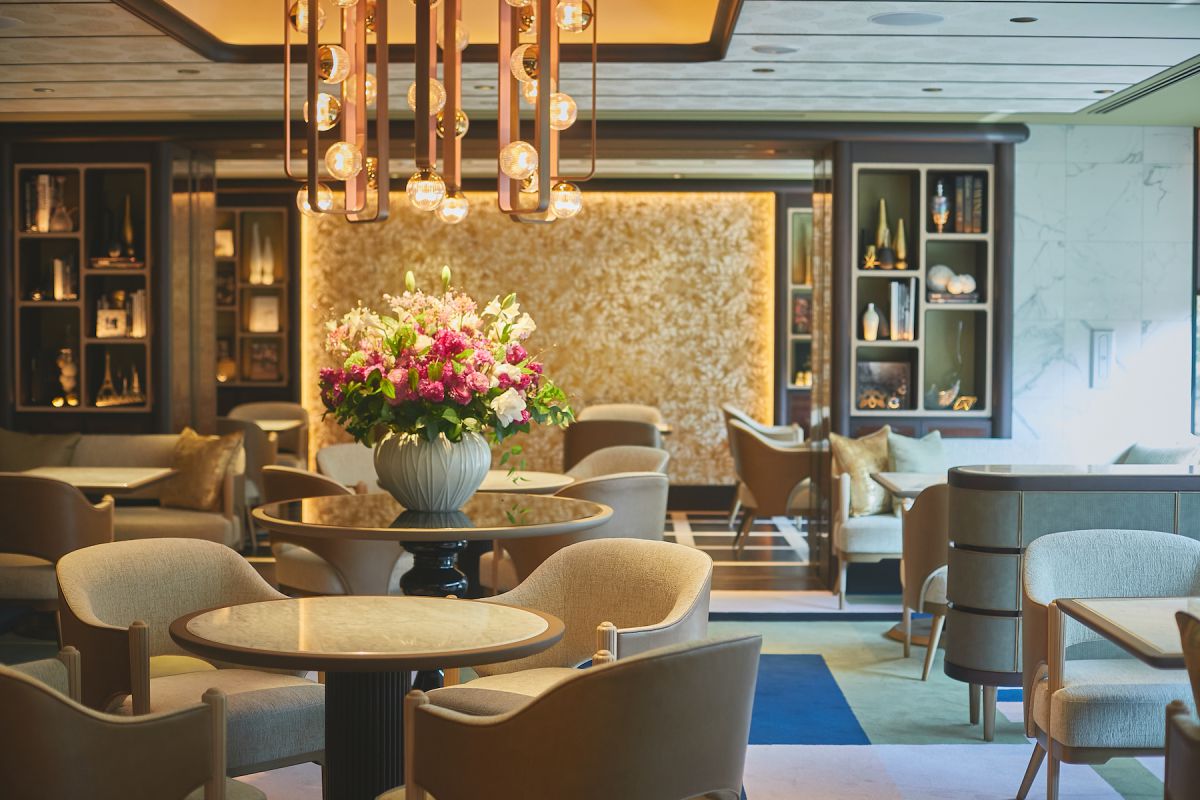 エントランスの大階段を上がった先に広がる2階のティーサロン「Salon dé The Fauchon」は、西洋のモダンな雰囲気に、和のモチーフが施された優雅な空間。