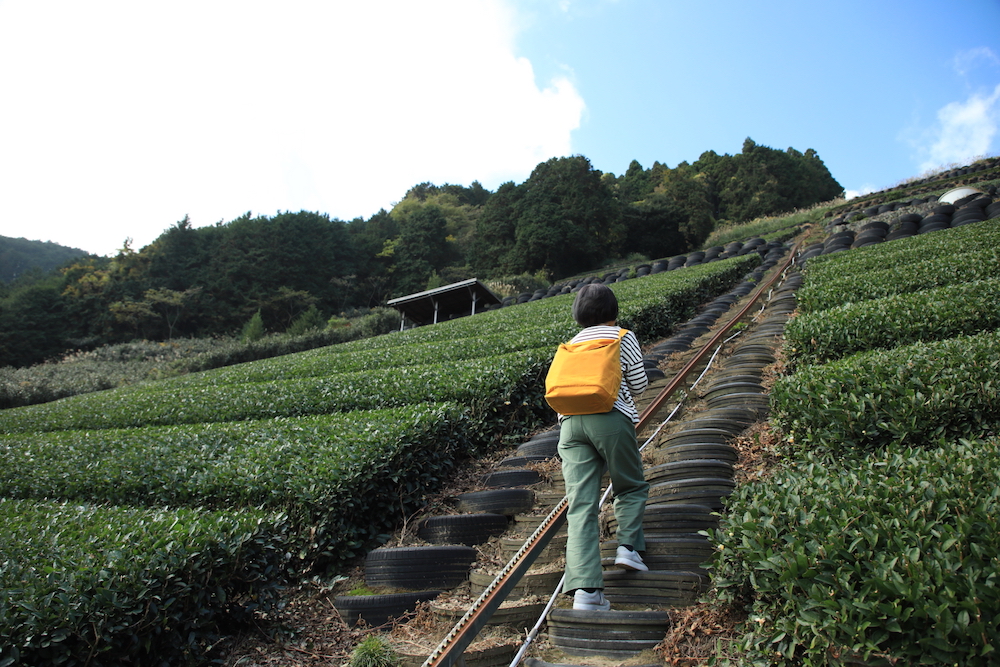テラスまではお茶セットの入ったリュックとクッションを受け取り、茶畑を5分ほど登ります。いただけるのは2種類の季節の茶葉を使ったお茶。夏は冷茶の場合もあるそうです。持ち込みは自由なので、周辺でお茶請けを買っていくのもおすすめ!