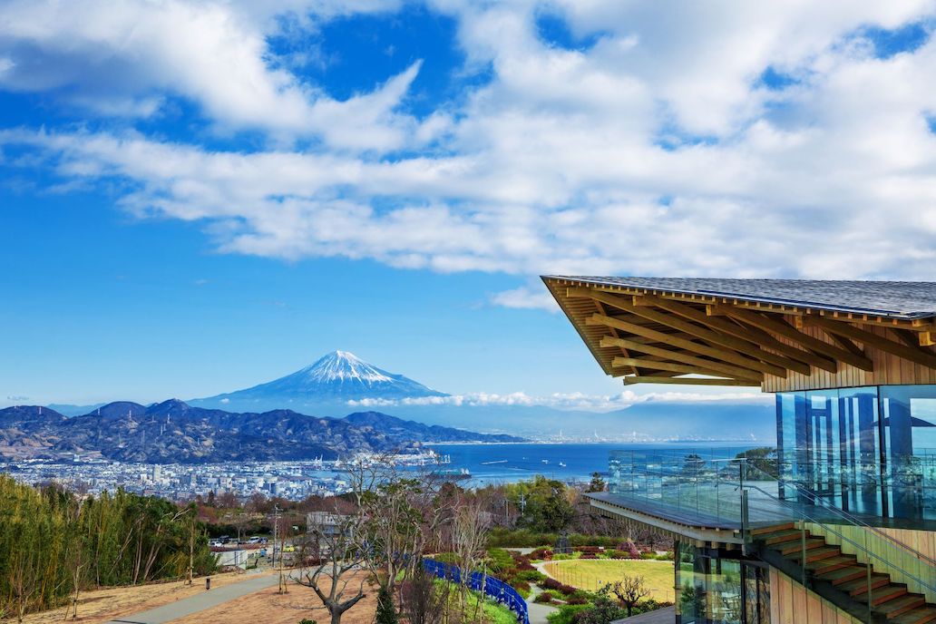 標高370mに広がる景勝地・日本平山頂に生まれた展望施設。隈研吾建築都市設計事務所が手がけた施設では、日本平の歴史や魅力を展示で紹介しています。施設から続く1周200mの展望回廊からは富士山や南アルプス連峰、駿河湾、三保松原など360度を一望のもとに。