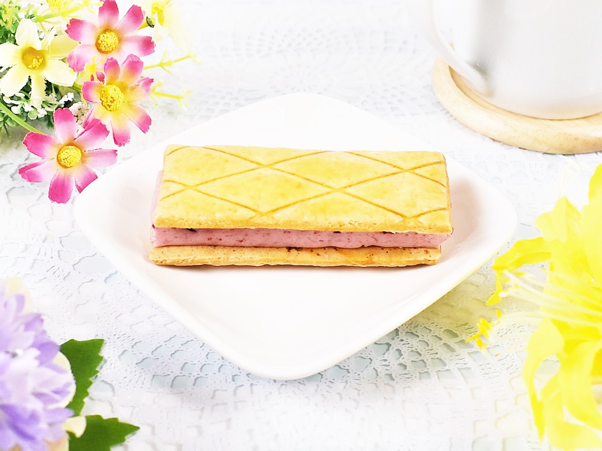 いちご入りのクリームをビスキュイで挟んだ「Uchi Café Spécialité 華いろいちごバタービスキュイサンド」。パッケージを開けた瞬間、濃厚ないちごのフレーバーがふわりと鼻をかすめていきます。しかもクリームの中にはクランベリーが入っているため、甘酸っぱいベリーの風味もポイントに。いちご×クランベリーといった“ベリーづくし”な見た目は、まさに春にピッタリなスイーツですよね。