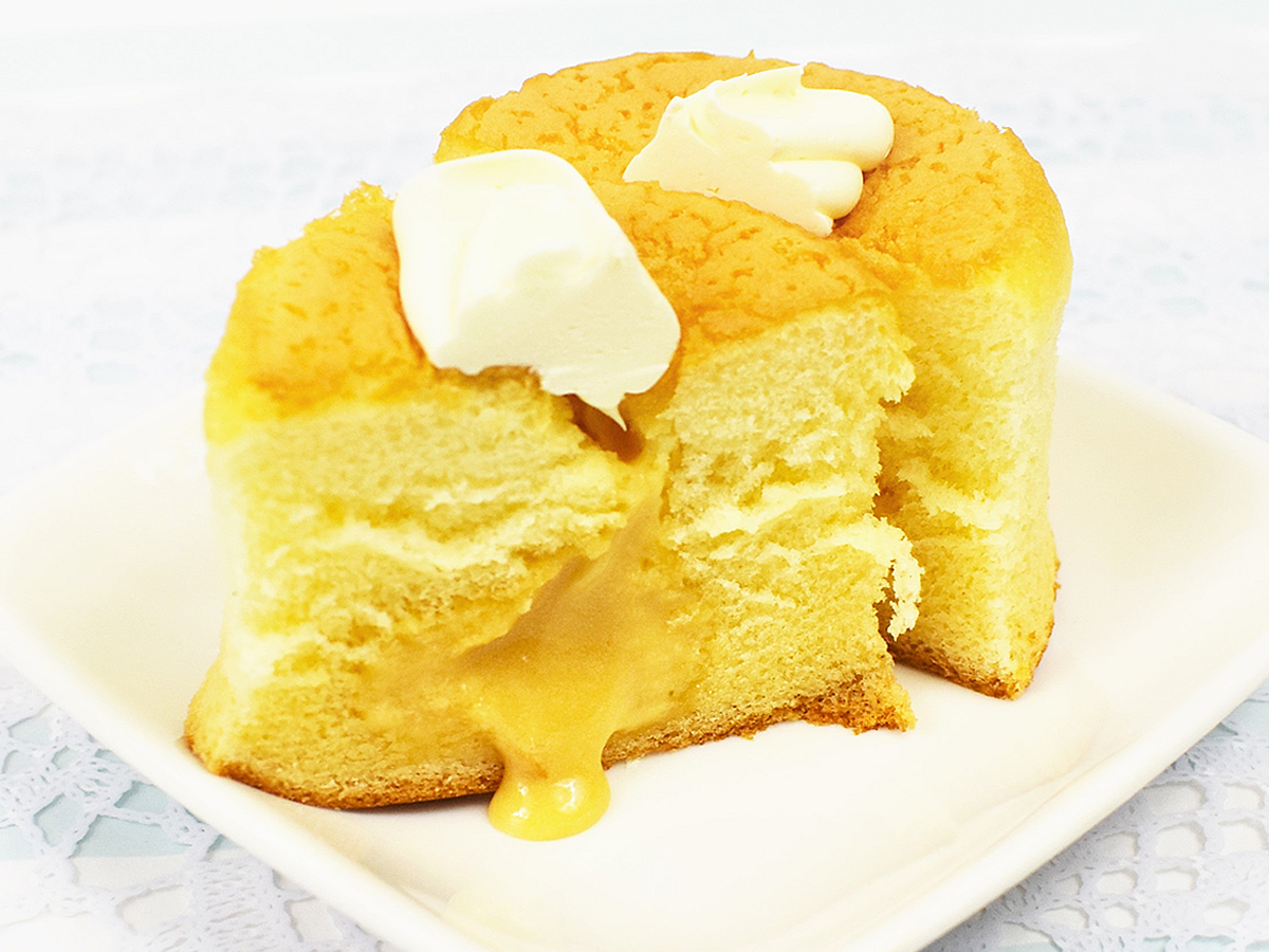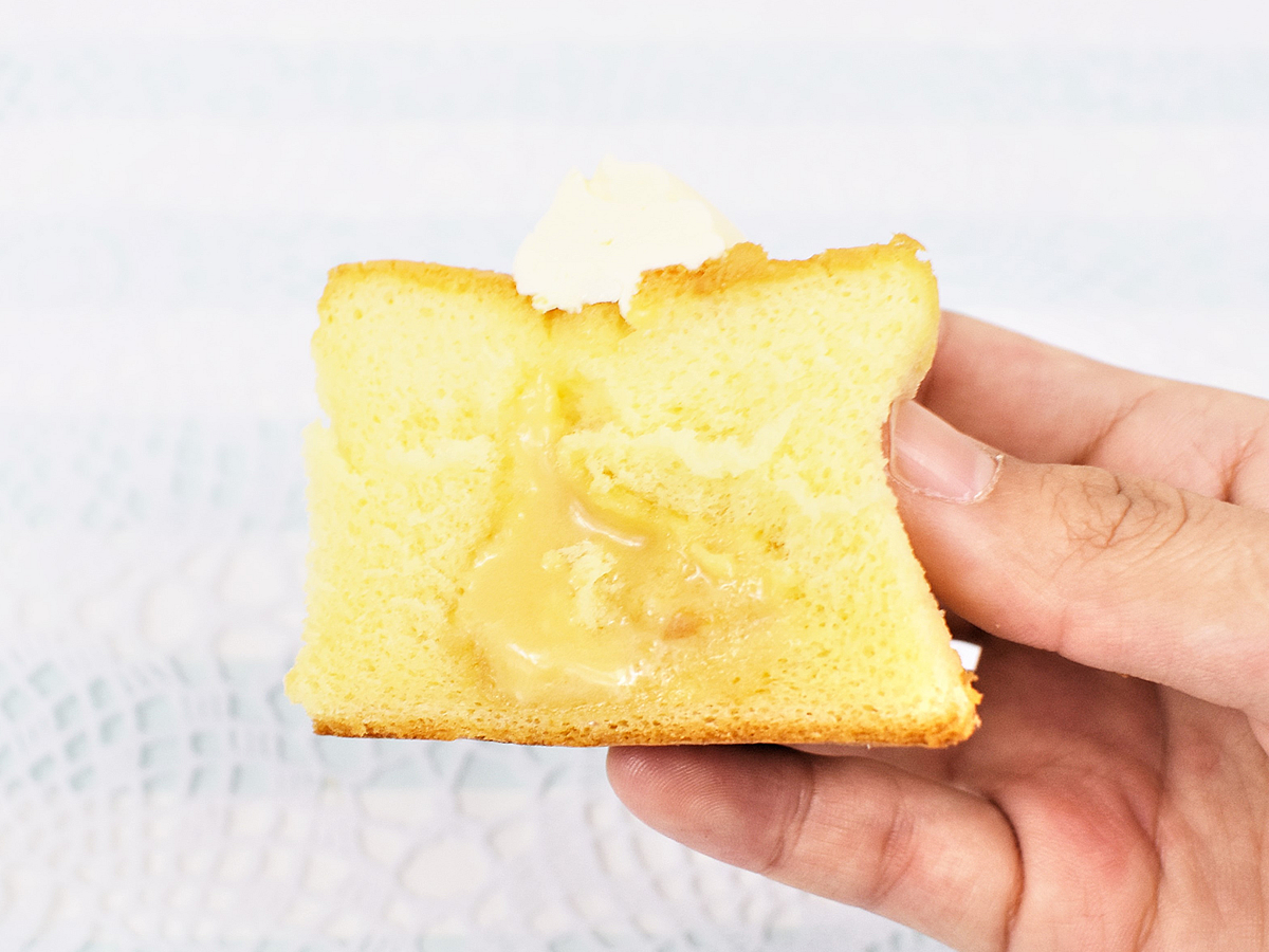 まるでシフォンケーキのような見た目の「Uchi Café Spécialité 3種のバター華ふわケーキ(焦がしバターソース入り)」。やわらかくふんわりとした生地にバタークリームをトッピングし、さらにケーキの中には焦がしバターソースを閉じこめています。