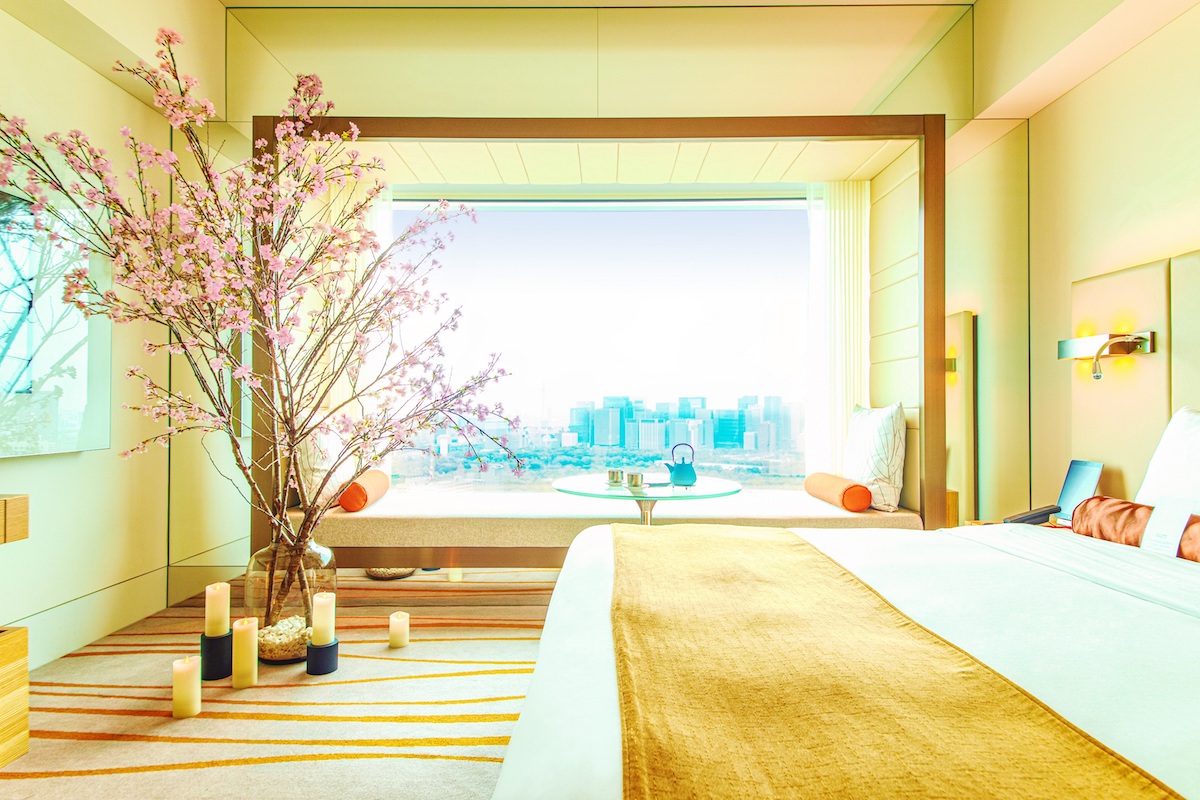「観桜~さくらROOM~」は地上約180mからの景色を望めるデイベッドがある窓際に大きな桜アートを飾ったお部屋に宿泊ができるプランです。雄大な景色と桜の共演は地上でのお花見とは一味違った魅力があります。