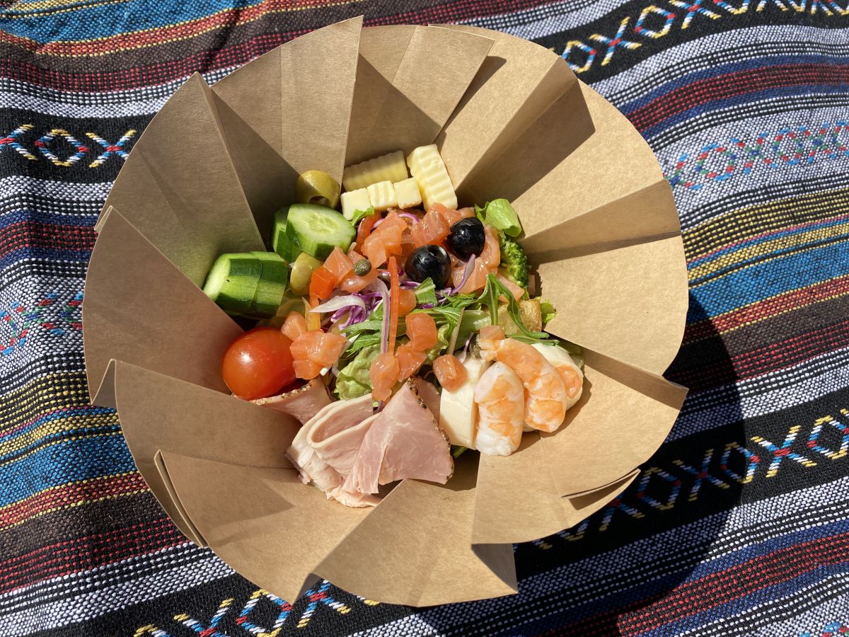 「シェフのごちそうサラダランチ」 1944円 は、フレッシュな野菜や、スモークサーモン、海老、ハム、チーズ、魚のテリーヌや クルトンなど、合計21種類もの具材が入り、ボリューム満点。これにスープかパンを足せば、大満足のサラダランチの完成です。