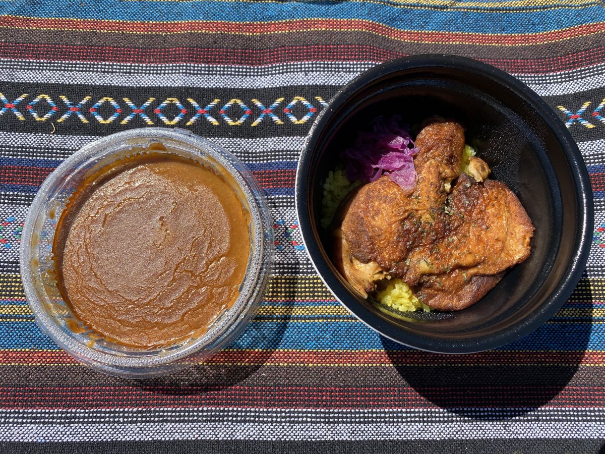 「骨付きチキンカレー 」1944円は、ホテル特製のカレーに、ターメリックライスと骨付きモモ肉をあわせたボリュームある一品。スパイスの香り豊かで、コク深い味わい。ホテル発祥のナポリタンに使用しているソースが入っていてほのかに酸味があるクセになるルーです。骨付きチキンはほろりと身がほぐれ食べやすい。