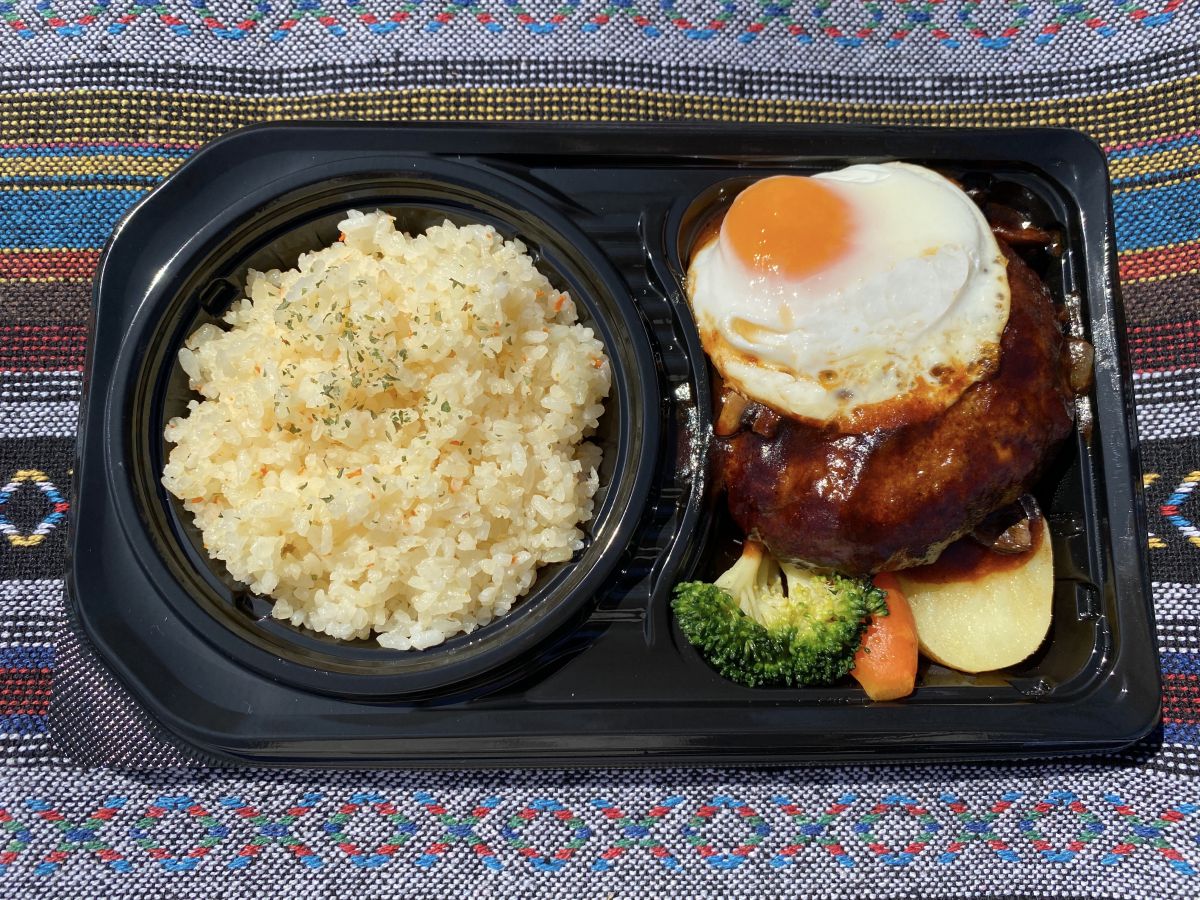 「ハンバーグステーキ」2160円には開業時より受け継ぐハンバーグに伝統のデミグラスソースと目玉焼きが添えられています。噛めば噛むほど肉の旨みが感じられ、満足度大。バターライスも絶品!