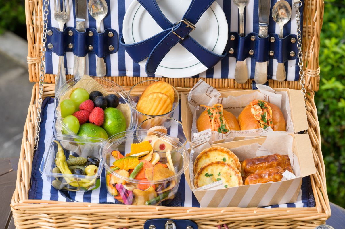 気になるメニューは、ホテル発祥のスパゲッティナポリタンを自家製パンにサンドした「ナポパン」に、ビーフパイ、キッシュ、サラダ、季節のフルーツ、焼き菓子。それにスパークリングワインまで!カトラリーまでセットになっているので、手ぶらでピクニックできるのは嬉しいですね。(バスケット、カトラリー、食器は要返却)