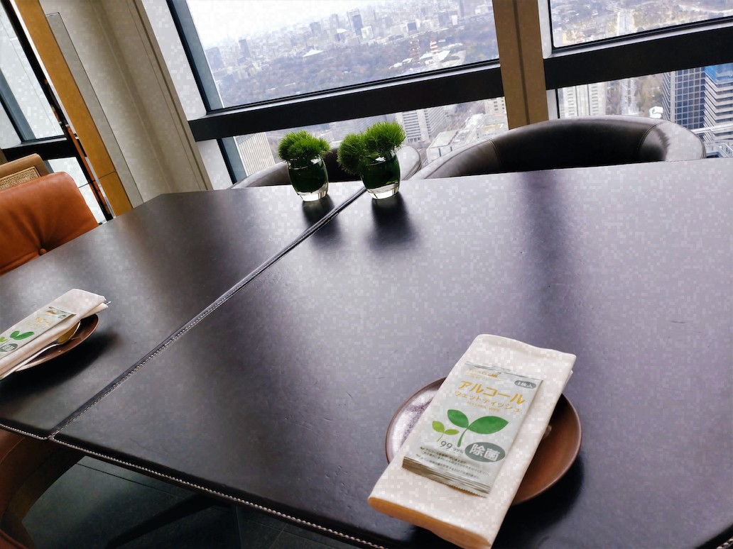 席につくと、アルコール除菌のウエットティッシュ、ナプキン、取り皿がサーブされていて、しっかりと感染症対策にも配慮がなされています。