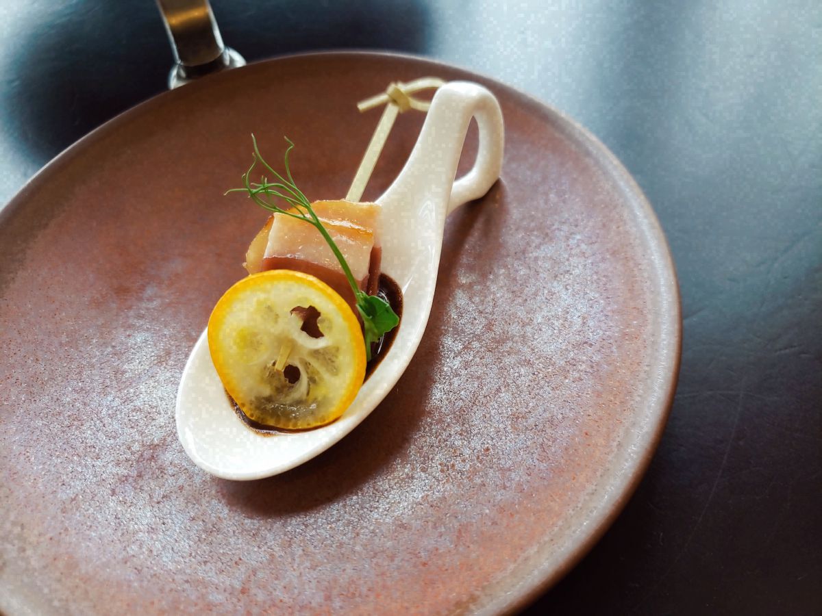 一番右から、「鴨のロースト 柑橘 チョコレートソース」。鴨肉にかけられたソースは、赤ワインソースをベースにビターチョコレートを加えています。赤ワインの酸味とチョコレートのコクや苦味が、味わいに深みを持たせている一品です。鴨肉との相性もよく、柑橘が濃厚な味わいにさわやかさがプラスされています!