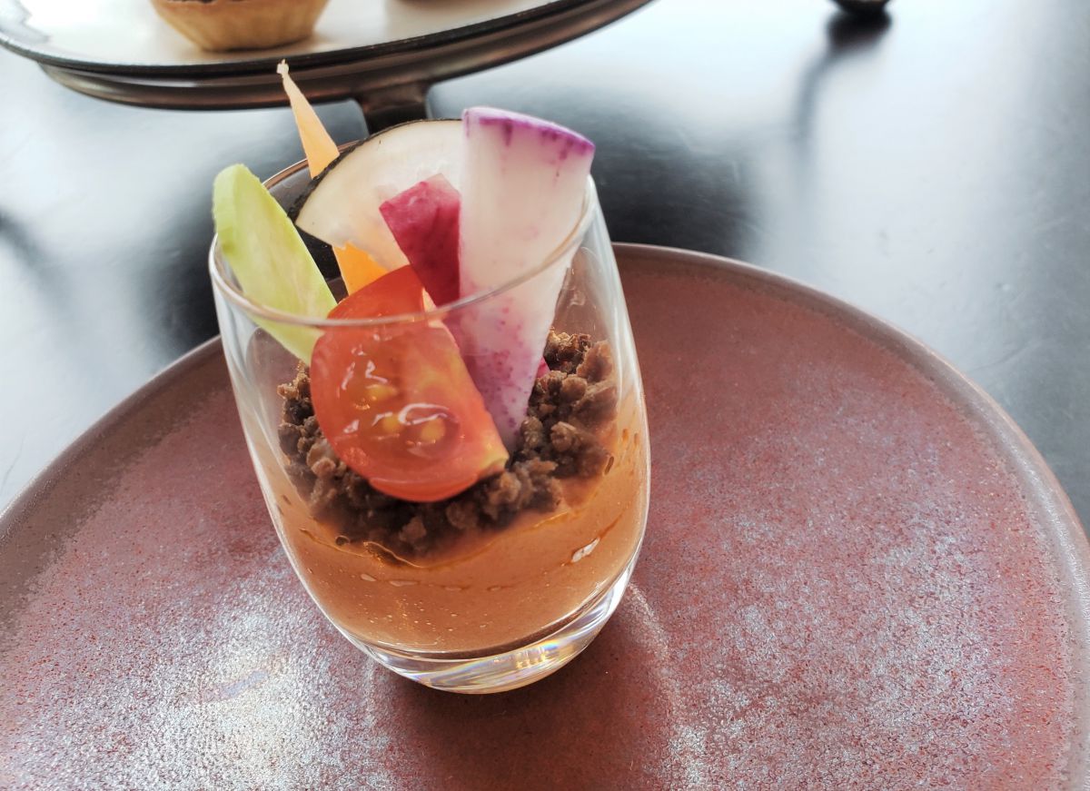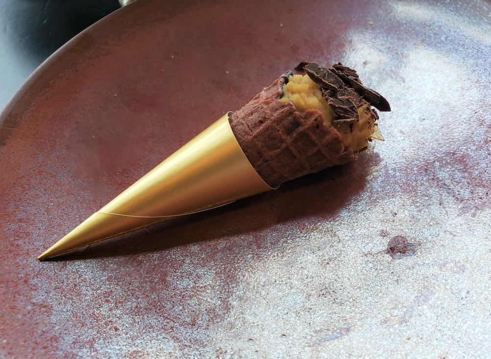 小さなソフトクリームのようなクリスピーコーンの見た目が可愛らしい一品です。濃厚なフォアグラと生クリームのムースの上に、削ったカカオ80%のオーガニックチョコレートがアクセントになっています。甘さ控えめのチョコレートが、濃厚なフォアグラにマッチしています。