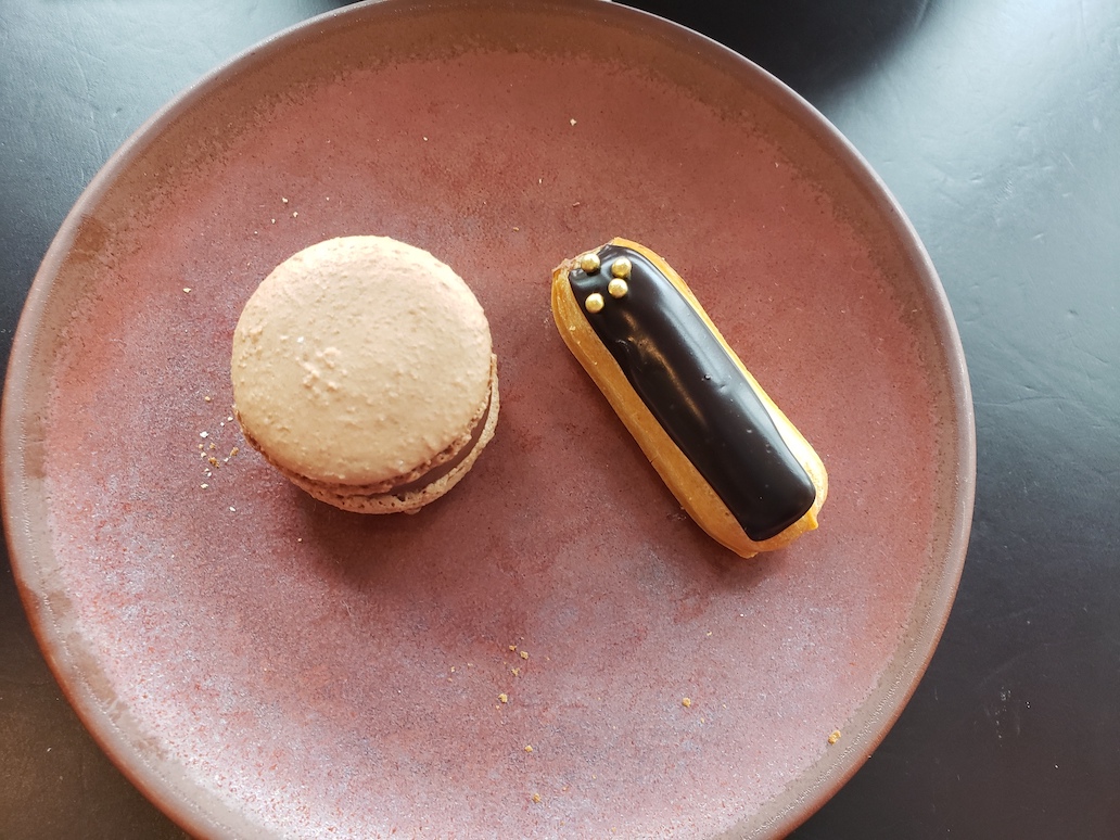こちらは、左が「マカロンショコラ」、右が「チョコレートエクレア」です。左のマカロンには、KAOKAの「ボナオ」で作ったガナッシュがサンドされています。「ボナオ」は、ミルクチョコレートのなかでも少し酸味があり、まろやかだけど甘すぎず、濃すぎない甘さのマカロンになっています。
