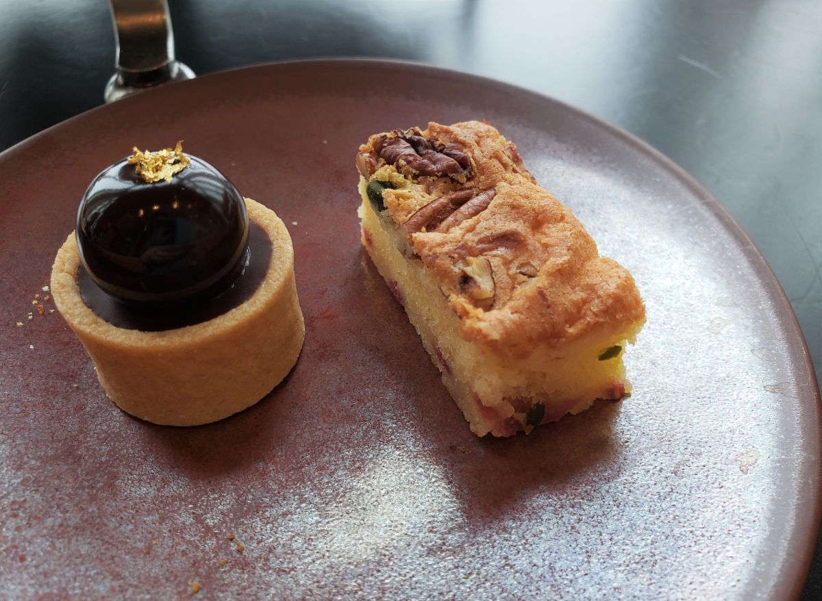 写真右の「カマンベールチーズ ドライフルーツ オーガニックワインジュレ」は、四角いタルトレットの中に、透明なオーガニックワインのジュレとエディブルフラワーがのぞくセイボリー。ドライフルーツの甘味と、カマンベールチーズの旨味がマッチしています。ワインジュレはとてもさわやかな味わいで、さっぱりと仕上げた一品になっています。
