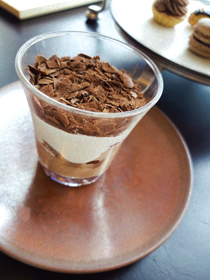 もう一つ注目したいスイーツは、「フォレノワール」。透明なグラスに何層も重なる茶色と白のコントラストが目を惹きます。
