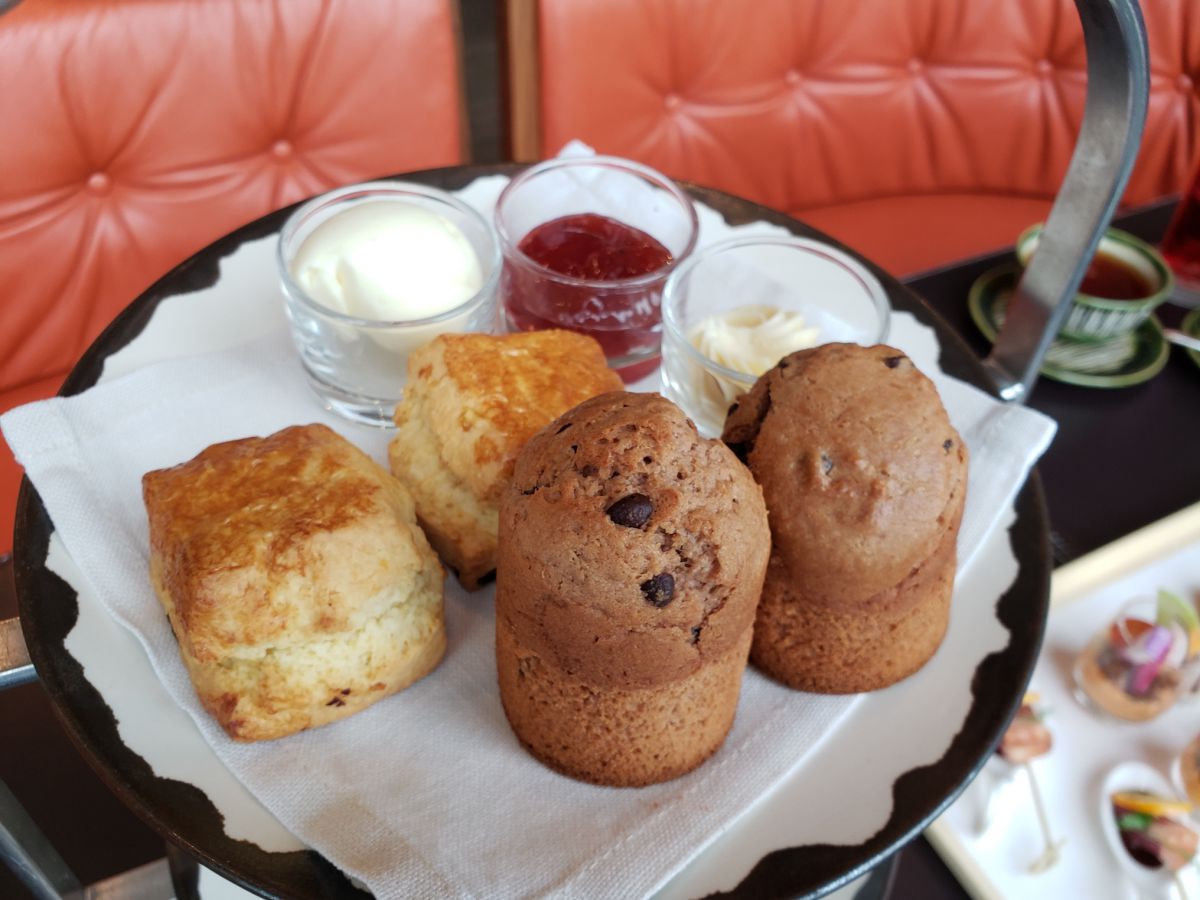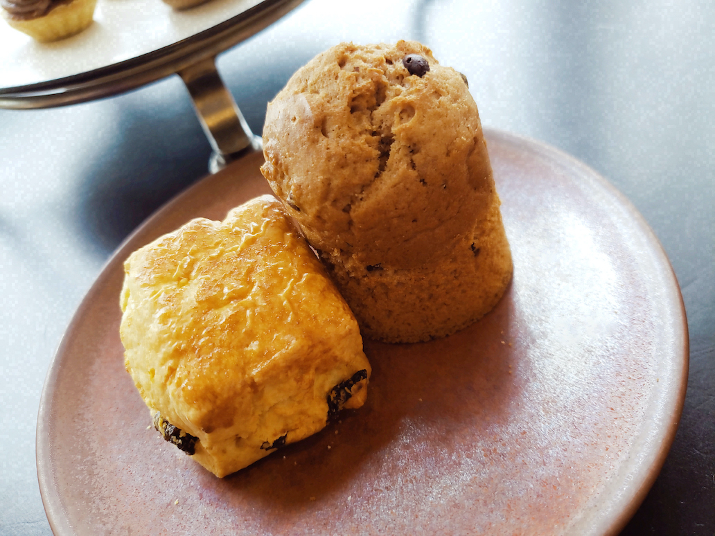 右は、オーガニックのココアを使用しているチョコレートスコーン。マフィンのような見た目で、表面はサクサク、中はふわっとした食感が特徴です。マフィンに似た見ためとは裏腹にすごく軽い食感で、ココアの優しい味わいも相まって、アフタヌーンティーの最後にピッタリなスコーンです。