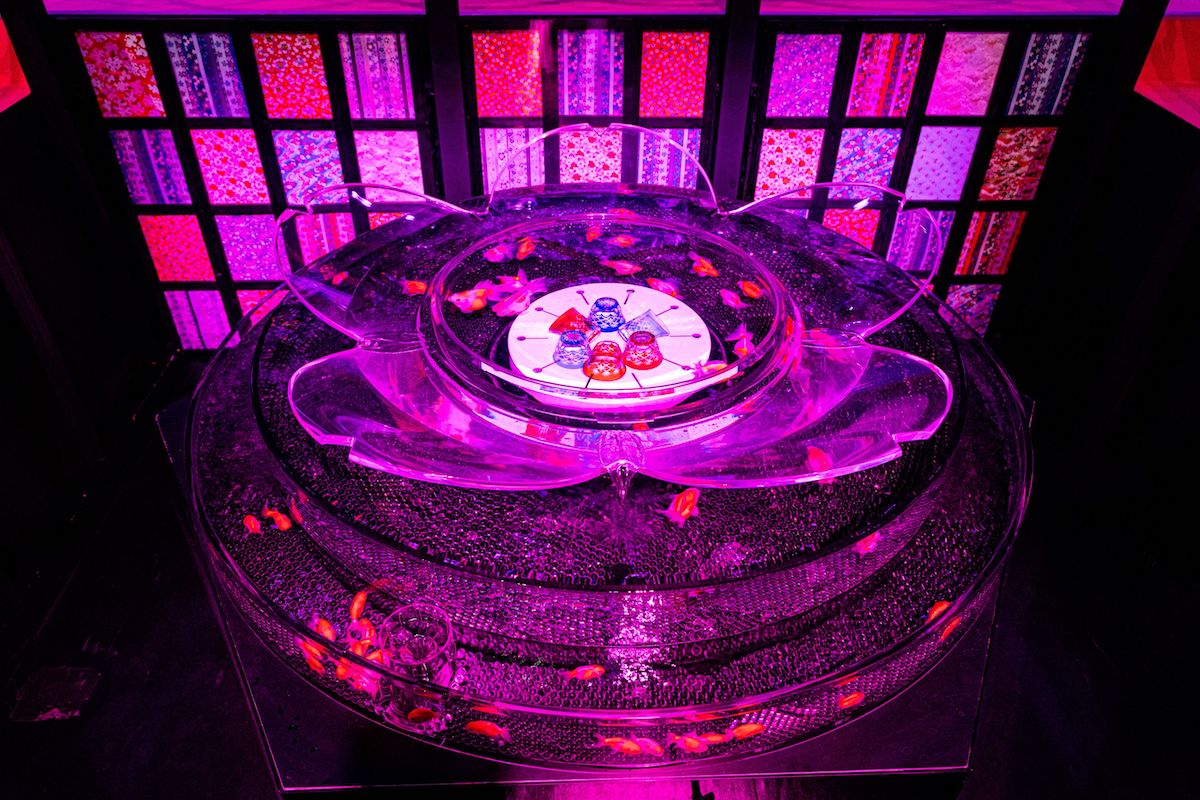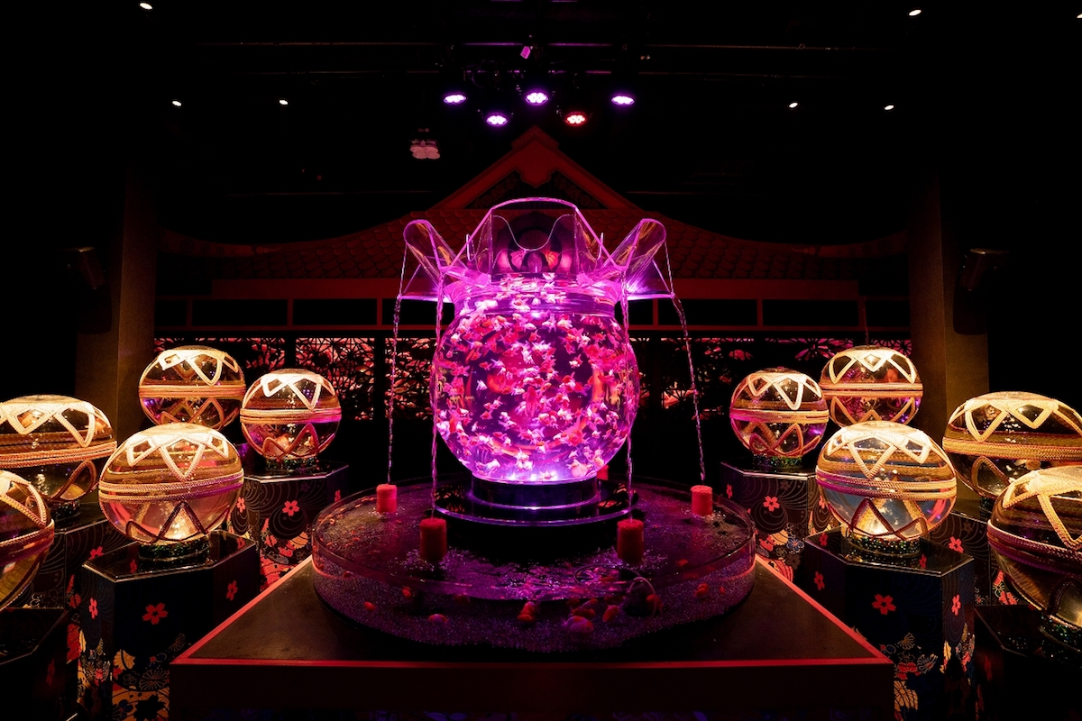 今回は桜の花びらをかたどった江戸切子や、煌めくクリスタルとファイバーライティングを織り交ぜた神秘的な枝垂れ桜のトンネルが出現。両サイドの壁から突出した円形のアクアリウムには金魚がコレクションされています。それらが一斉に桜色に染まった瞬間、これまで体験したことのない神秘的な空間に。