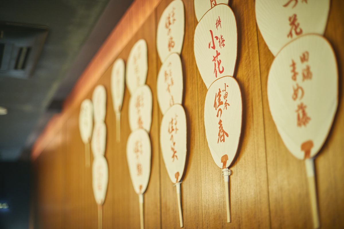 芸妓さんや舞妓さんの名入れの「京丸うちわ」もたくさん飾られていて、花街の住民にも愛されているお店なのだとわかりますね。