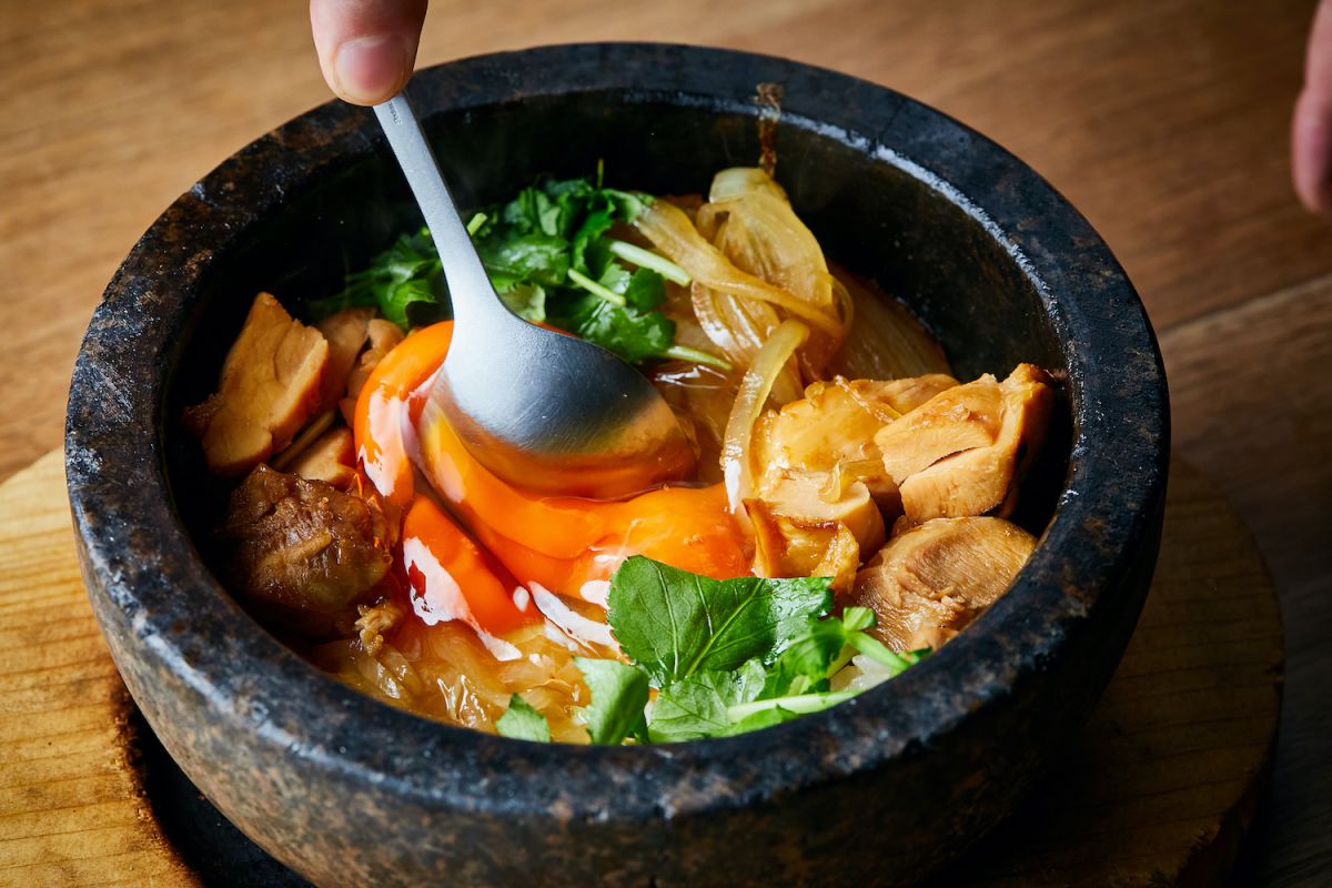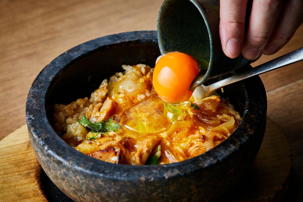 最後の1個は、お客様の目の前で。半熟で食べても美味しい、弾力のある卵がとろり。石鍋のふちあたりから、どんどん香ばしい香りが漂ってくるのがたまりません。