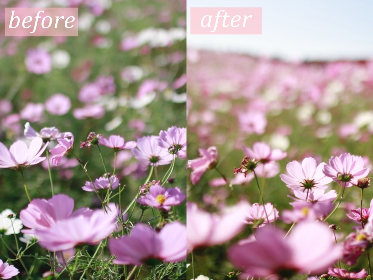 上から見下ろして撮影すると草花しか映らなかったのに、目線を下げて撮影すると空も映り込み、奥行きのある写真を撮ることができますよ。
