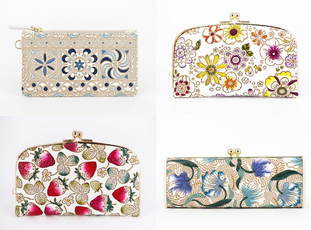 花柄や個性的なエジプト柄など、100種類以上の柄を揃え、真っ白な牛革に型押しをして職人がひとつひとつ手作業で彩色を施した伝統工芸品。きっとお気に入りの柄のお財布、名刺入れ、ペンケースなどに出合えるはず。