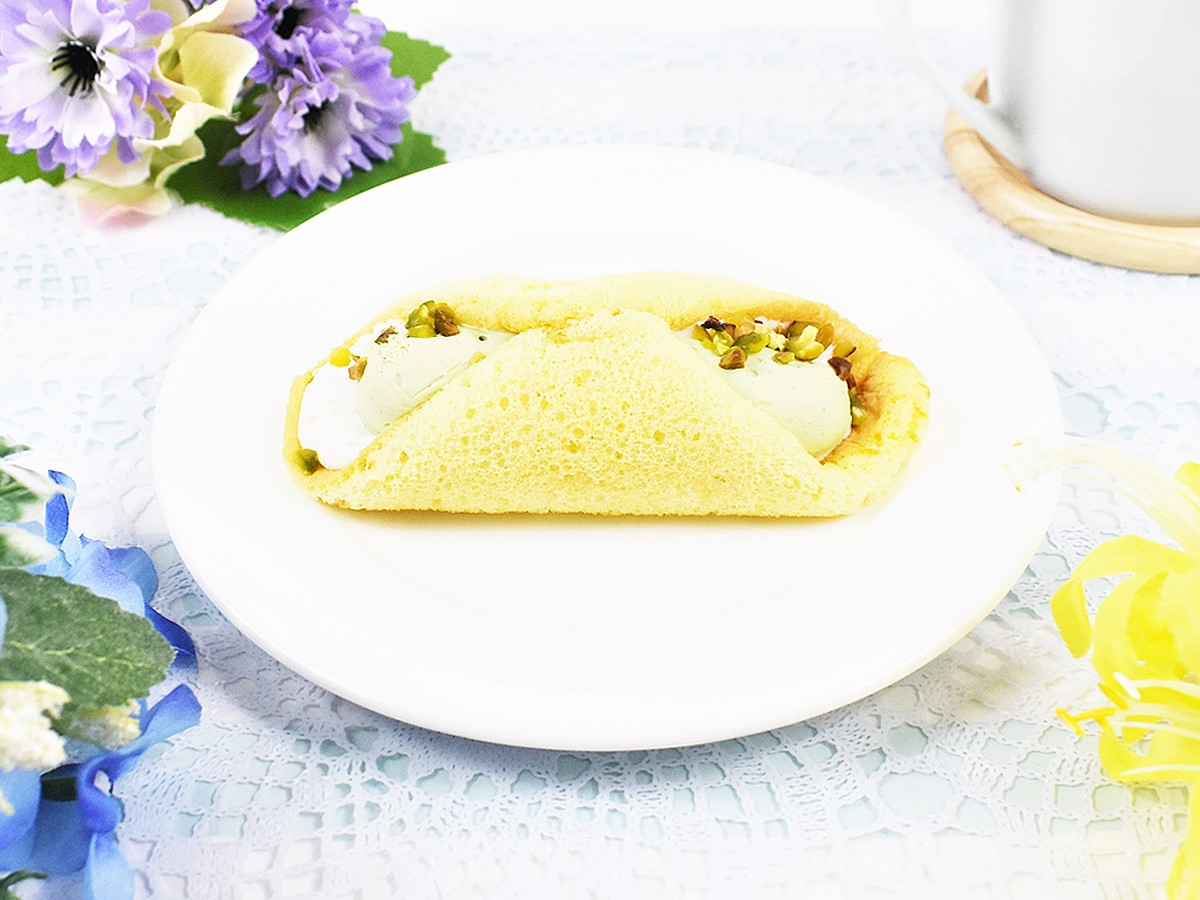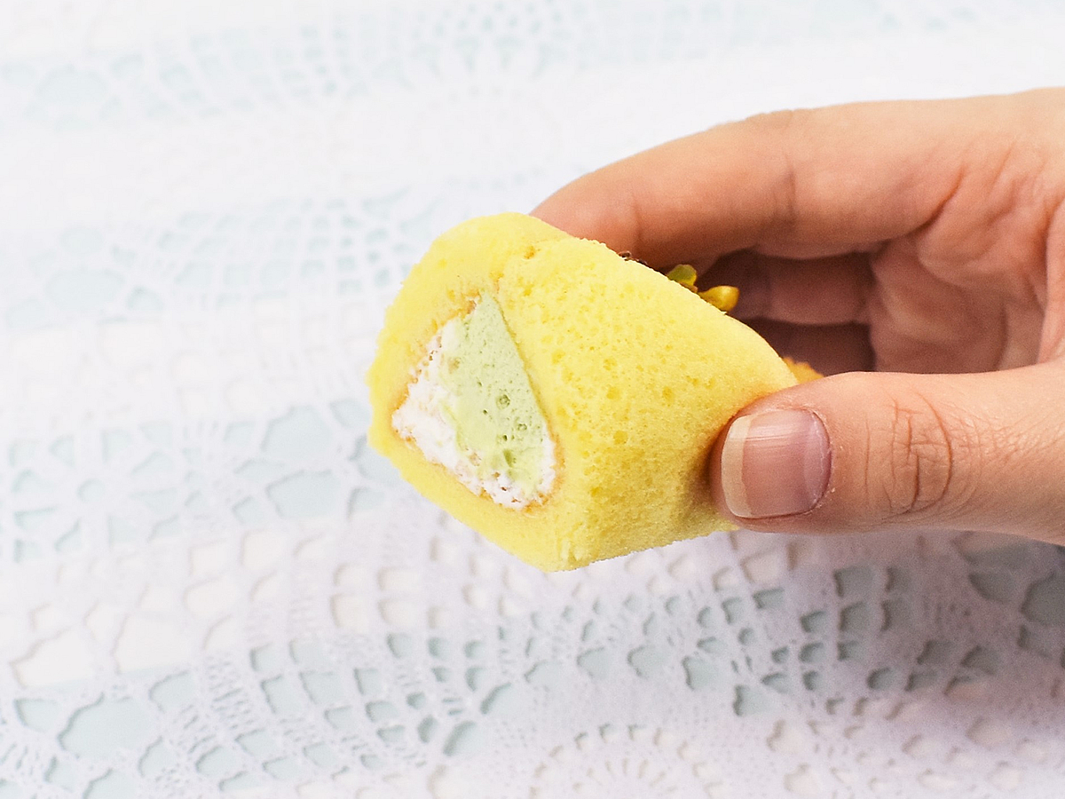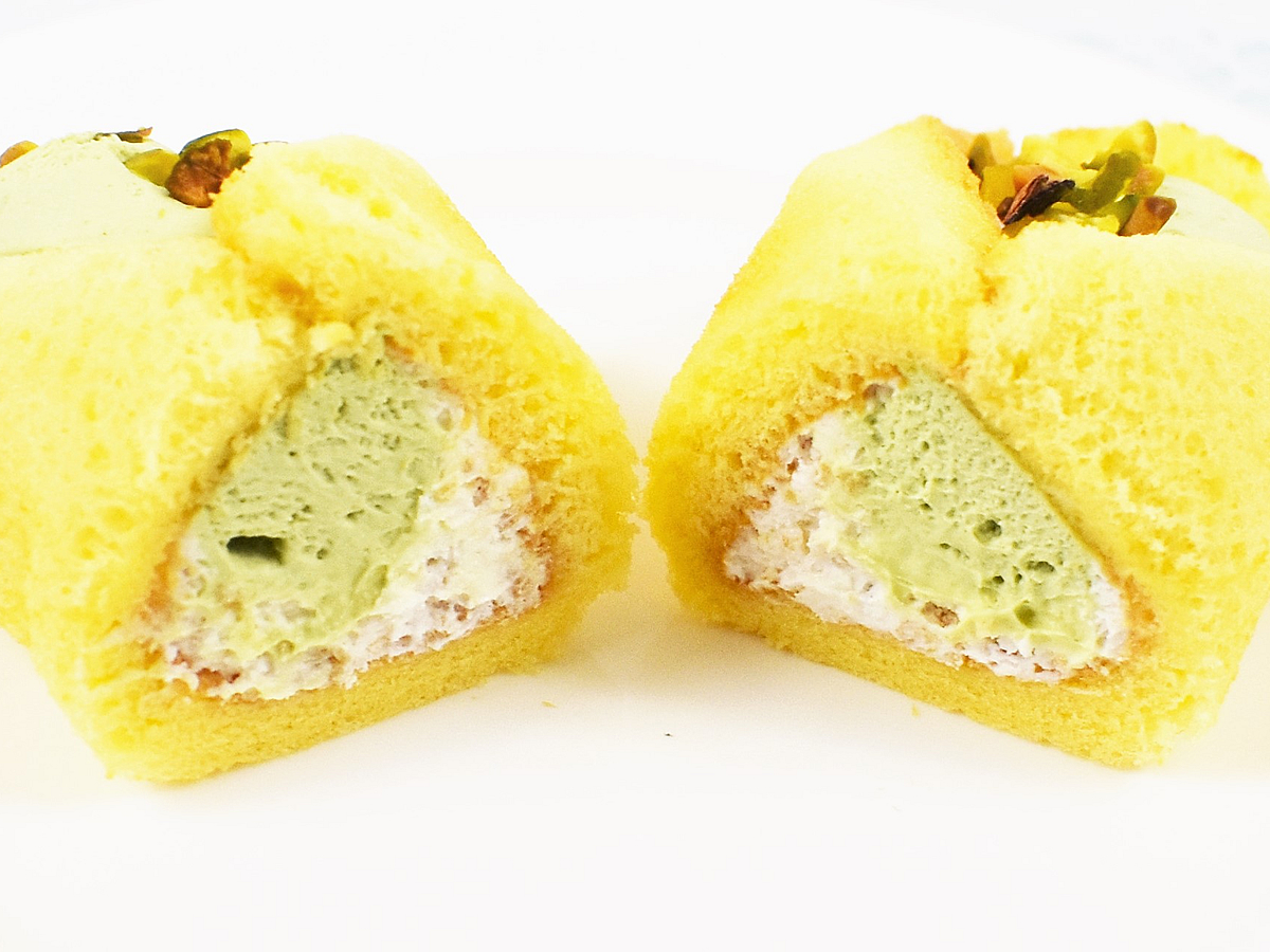 スポンジ生地でたっぷりのクリームを包んだ「クルリン -ザクふわくるりんケーキ(ピスタチオ)-」。食べてみてまず驚いたのが、見た目以上にふわふわな生地です。きめ細かく弾力のある生地は、まるで空気が入っているかのようにふんわりとした食感。ケーキにしては甘さも控えめで、上品な舌触りがたまりません。
