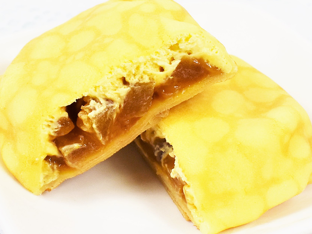 一見シンプルな見た目の「もっちりクレープりんごキャラメル」。まずは中身を確かめるべく、半分にカットしてみました。すると中からキャラメルソースを纏ったりんごがお目見え。カスタードホイップもたっぷり入っており、まったりとした甘い香りを漂わせています。