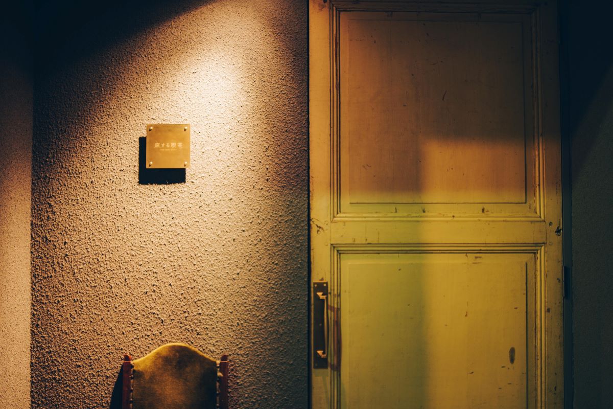 そんな多くの人の期待をもとに完成した「旅する喫茶」は、高円寺から徒歩2分、細い路地の2階にあり、道に面した1階にはこのような扉が。外から店内の様子を見ることはできず、この扉の先にどんな空間が広がっているのか、わくわく感をかきたててくれます!