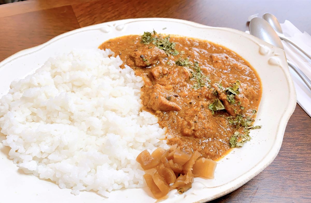 「旅する喫茶」のもう1つの看板メニューがカレーです。その名も「旅する喫茶のチキンカレー」1000円。小麦粉やルーを一切使わず、野菜を煮込みスパイスを加えて作り上げるというこちらのカレー。